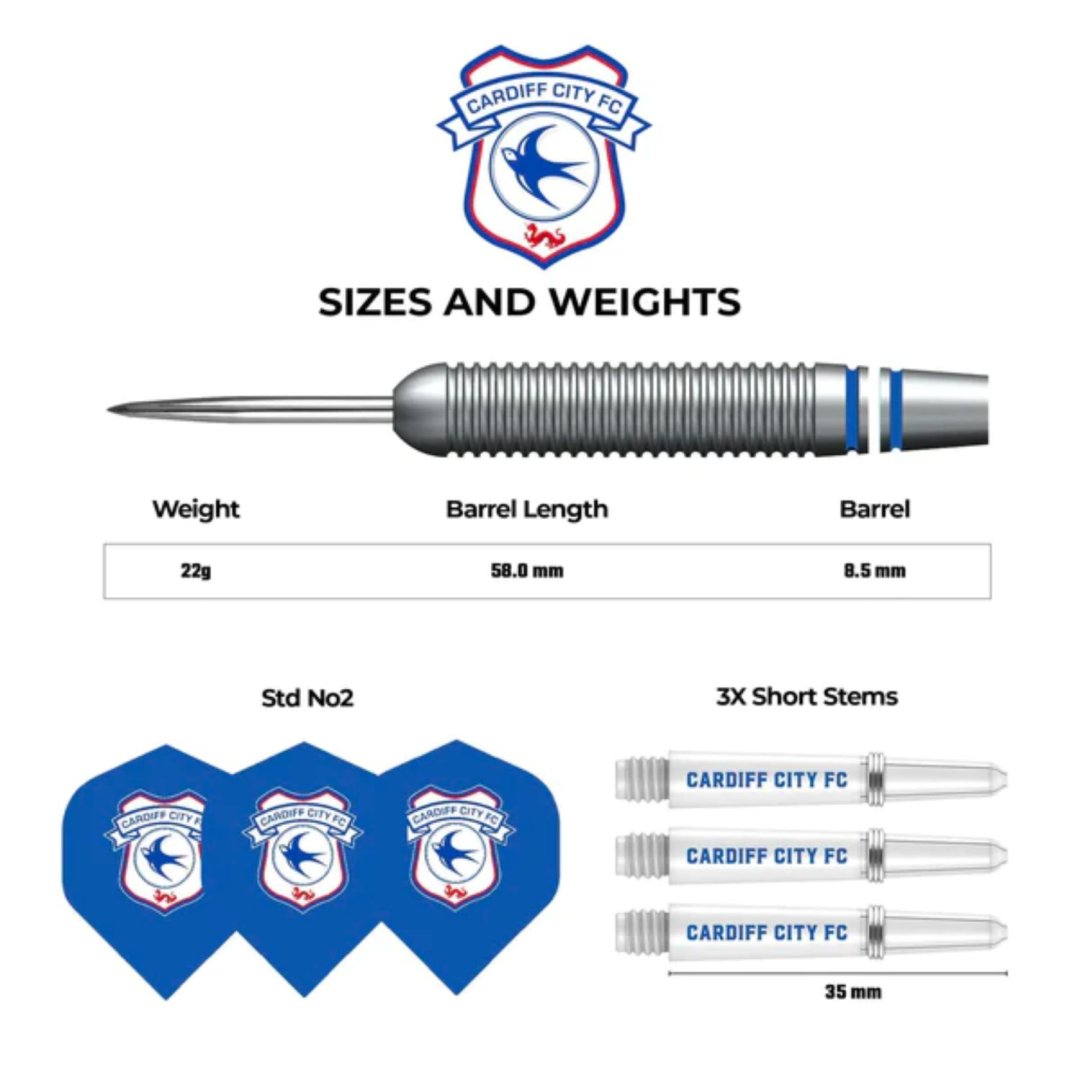 Piłkarskie lotki FC Cardiff City Steel Darts to mosiężne lotki z radełkowanymi lufami ozdobionymi niebiesko-białym paskiem. Lufy są wyposażone w nylonowe uchwyty FC Cardiff City i pałki FC Cardiff City.