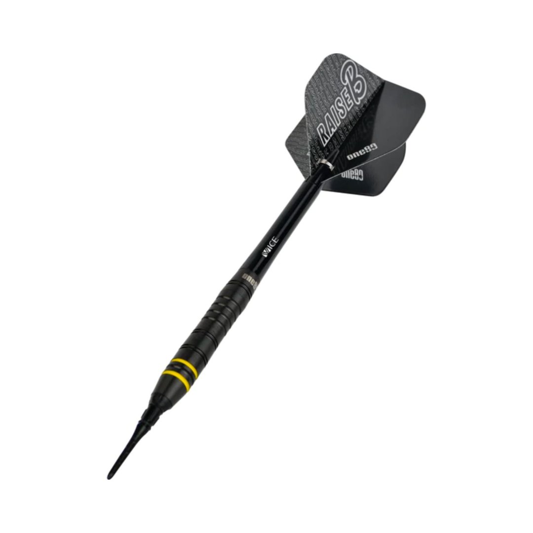 Miękkie lotki One80 Raise B to lotki wolframowe (80% wolframu) z czarnymi lufami ozdobionymi żółtymi paskami.