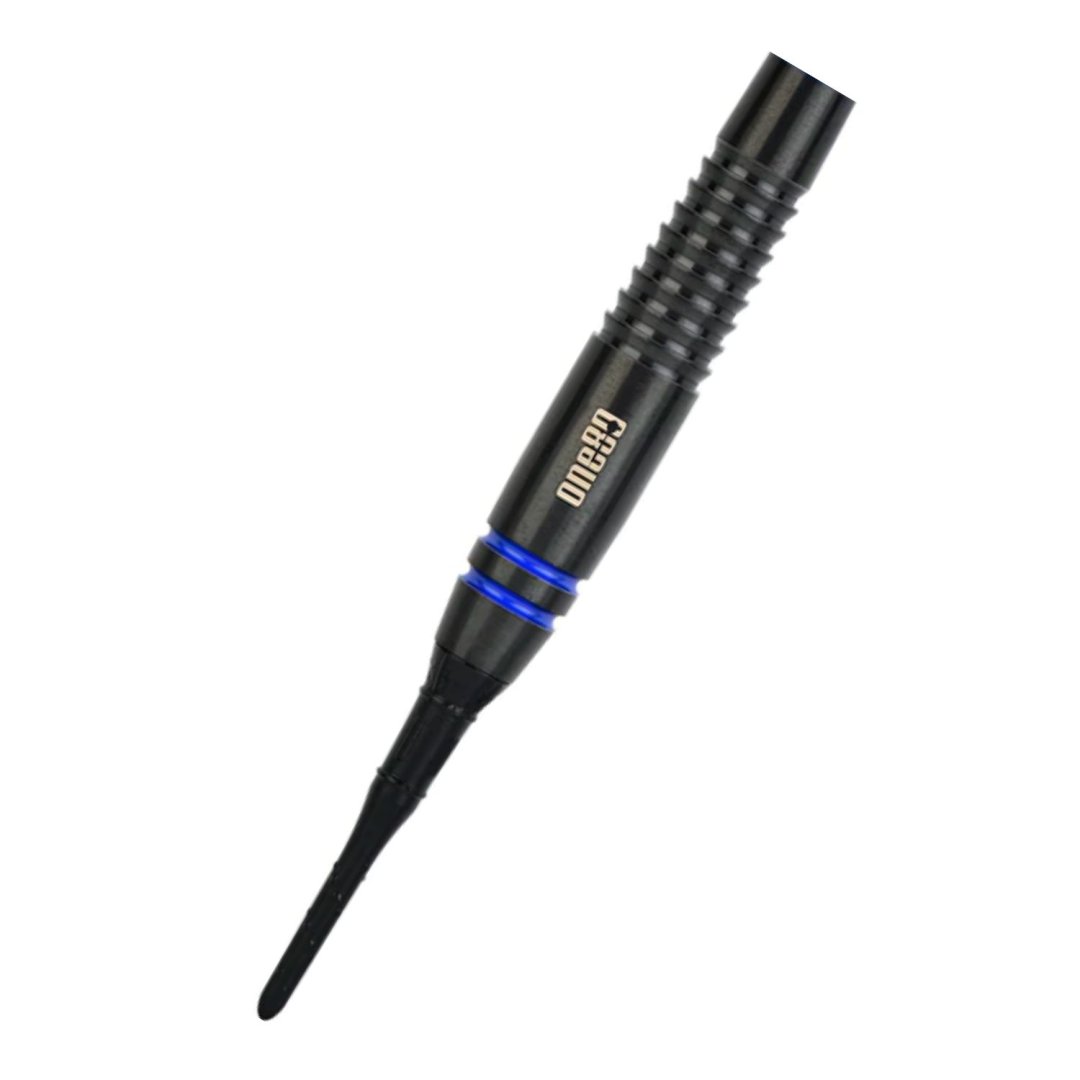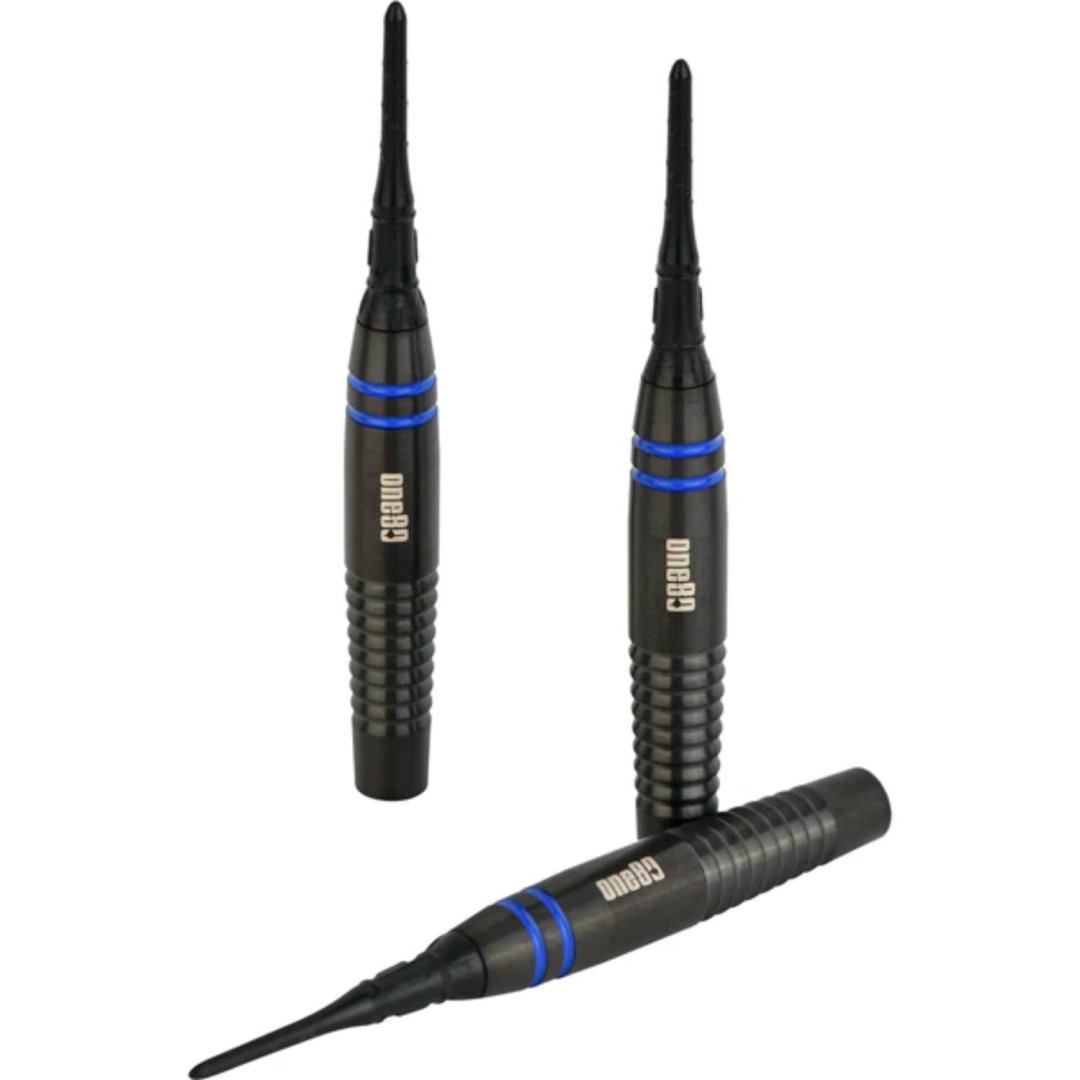 Miękkie lotki One80 Raise B to lotki wolframowe (80% wolframu) z czarnymi lufami ozdobionymi niebieskimi paskami.