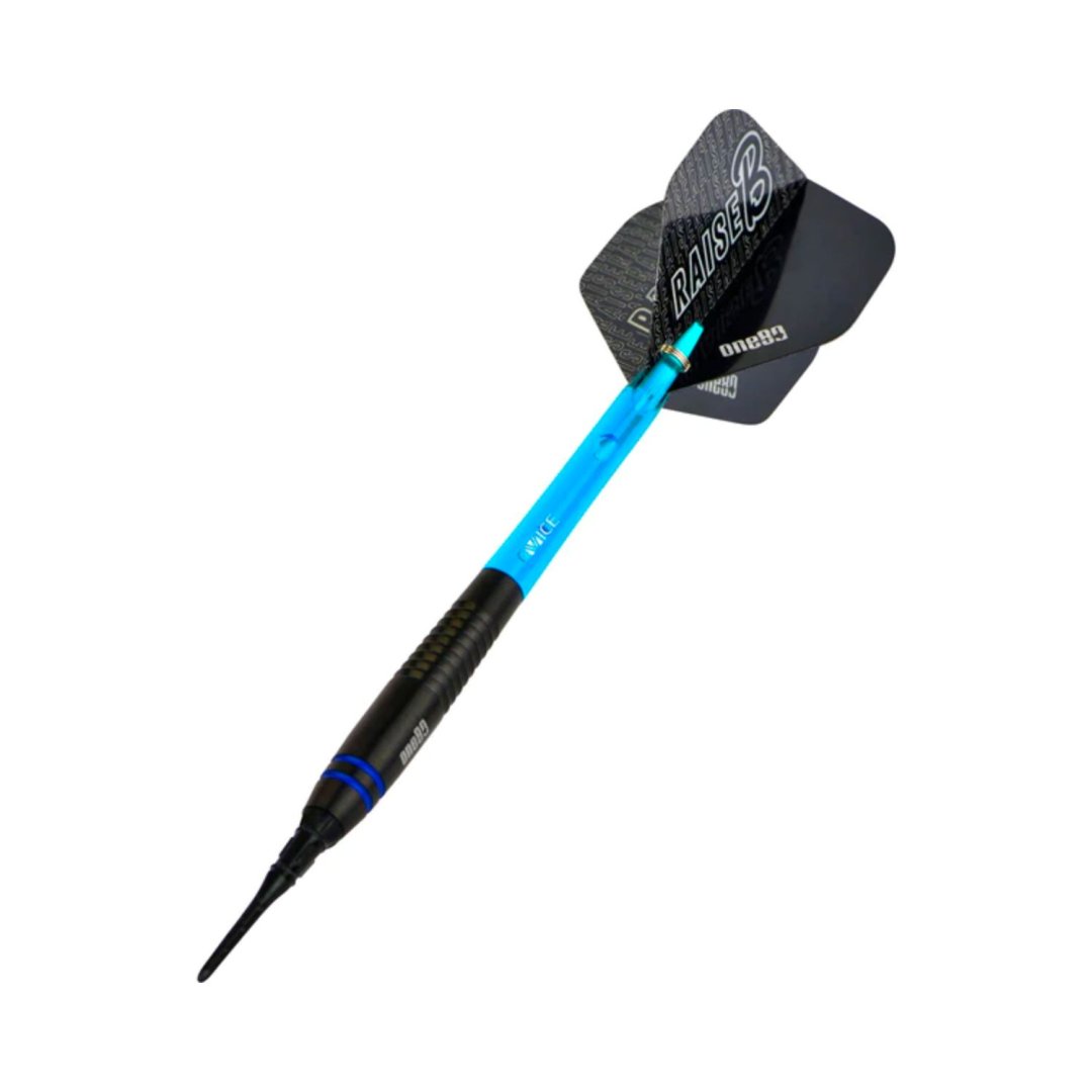 Miękkie lotki One80 Raise B to lotki wolframowe (80% wolframu) z czarnymi lufami ozdobionymi niebieskimi paskami. Uzupełniają je nylonowe uchwyty i pałki.