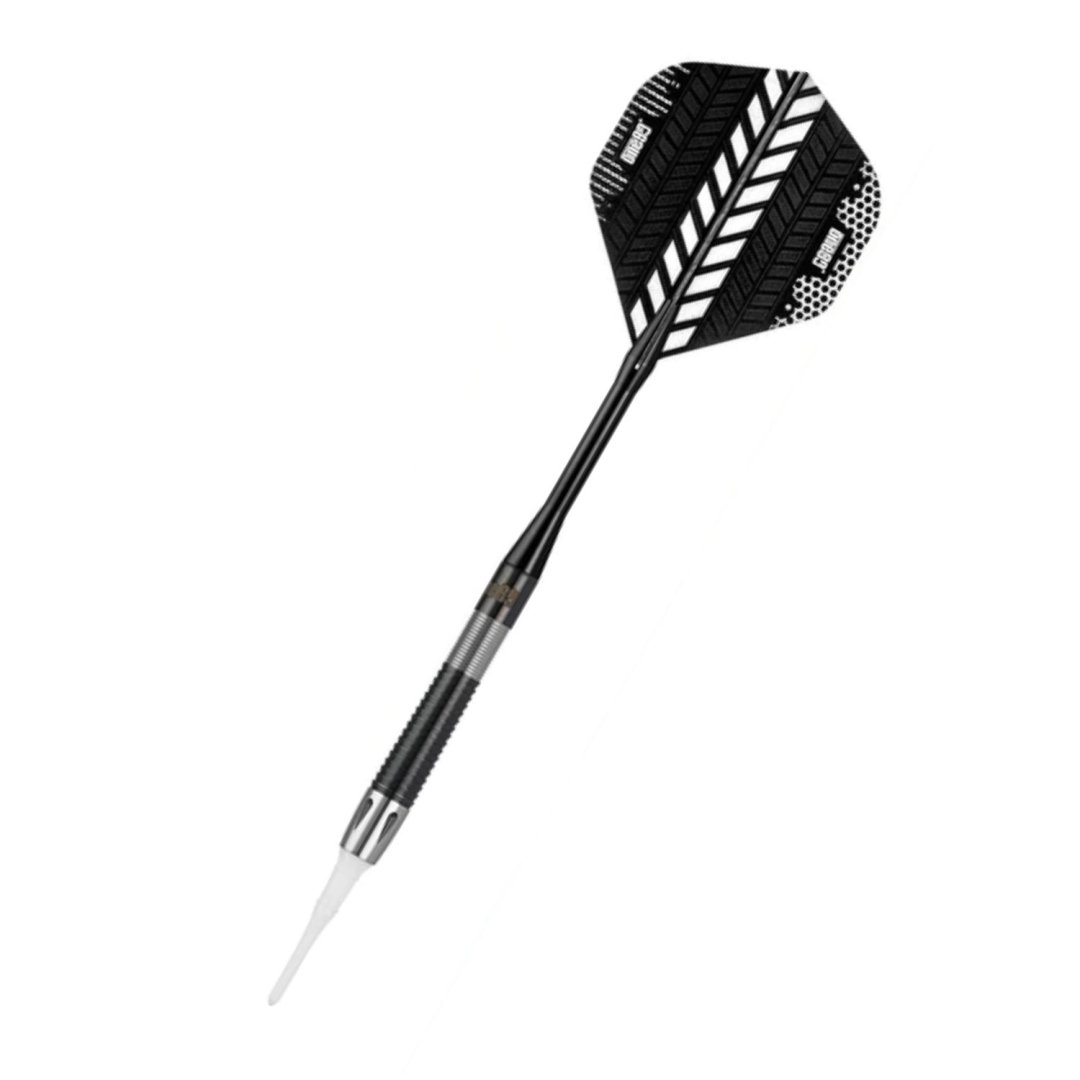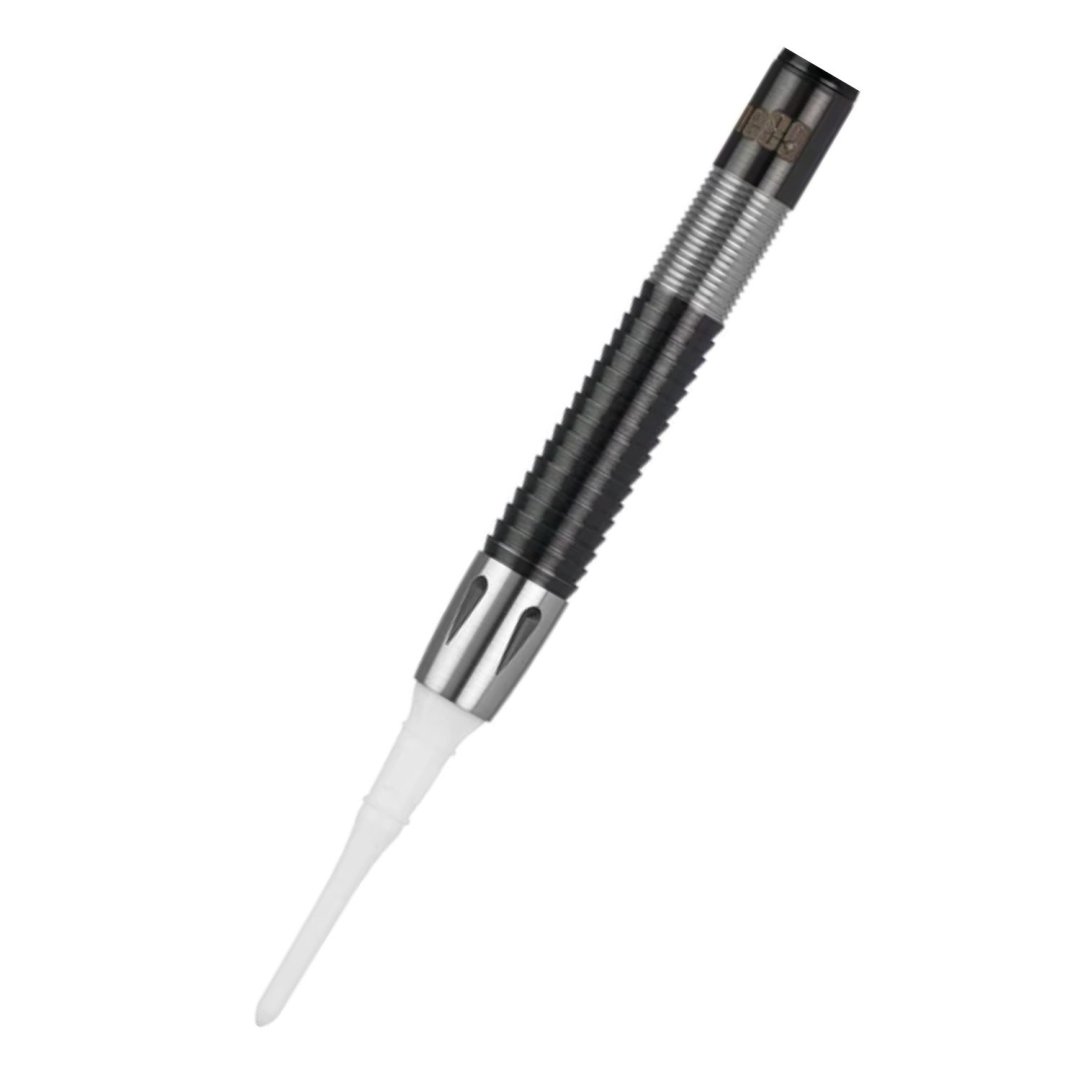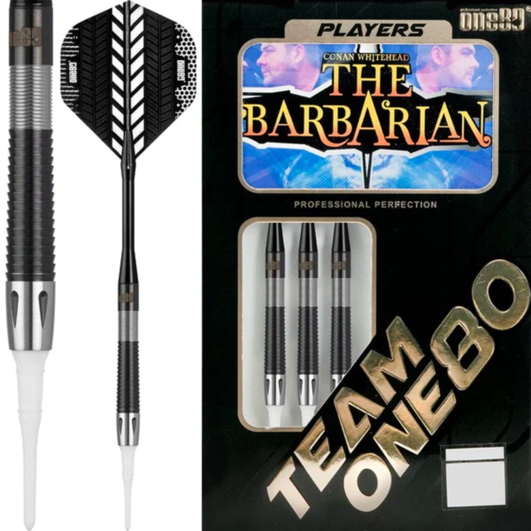 Miękkie rzutki One80 Conan Whitehead to wolframowe rzutki (90% wolframu) z czarnymi i srebrnymi rowkowanymi lufami. Uzupełniają je nylonowe uchwyty i uchwyty.