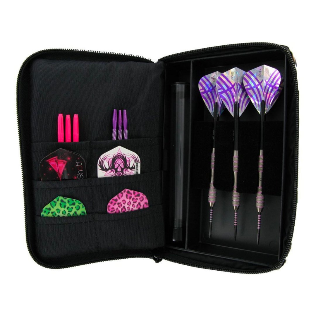 Etui na rzutki, które oferuje dużo miejsca na rzutki i inne akcesoria. Piankowa podkładka chroni rzutki przed uszkodzeniem. Etui zawiera małe kieszenie na eskadry i inne drobne akcesoria. Zawiera pudełko na końcówki.