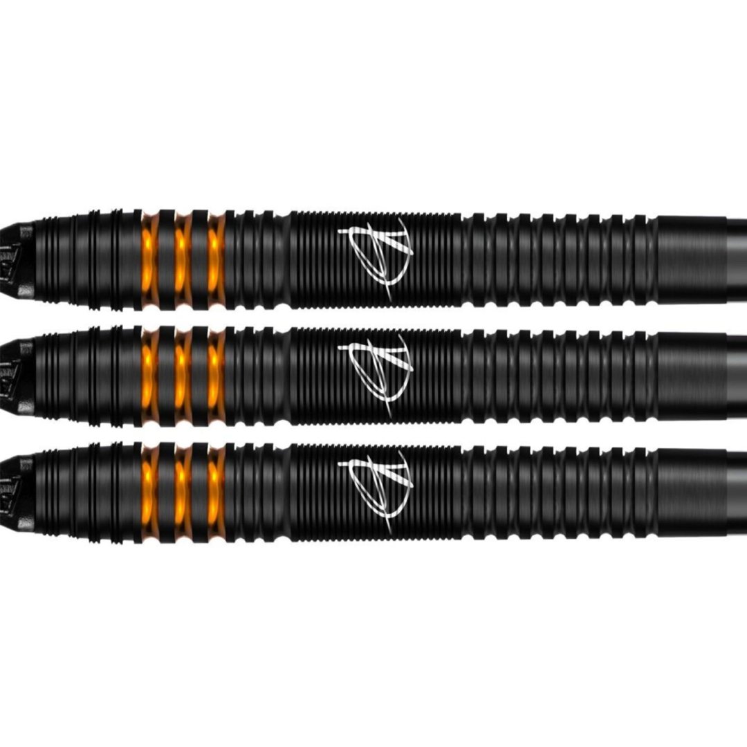 Miękkie lotki Dirk van Duijvenbode to lotki wolframowe (90% wolframu) z czarnymi rowkowanymi lufami ozdobionymi brązowymi paskami i podpisem Dirka.