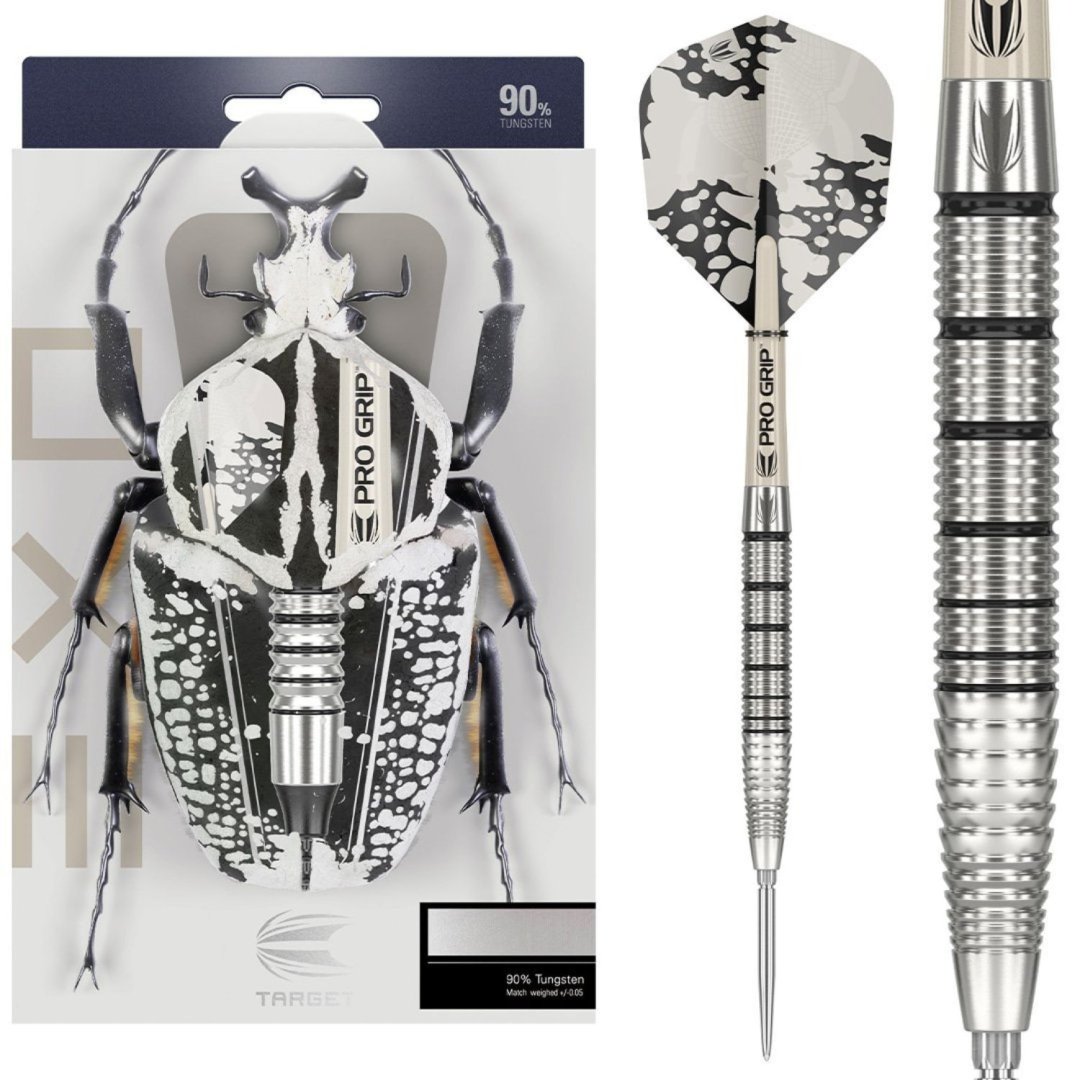 Stalowe rzutki wolframowe Exo SP (90% wolframu) to rzutki o unikalnym designie. Beczki są podkreślone czarnymi rowkami. Lufy są wyposażone w uchwyty Pro Grip, uchwyty Target i końcówki Swiss Point.