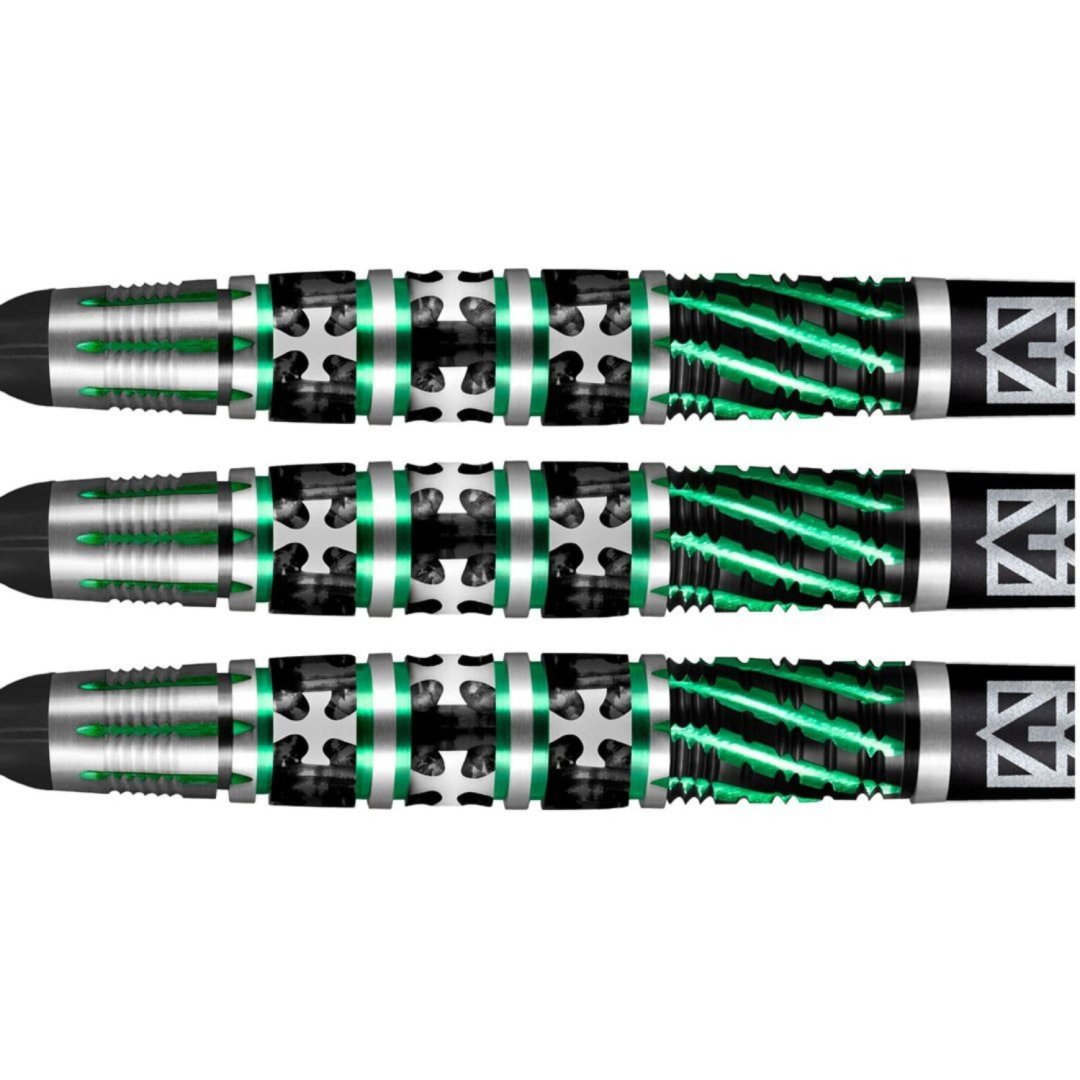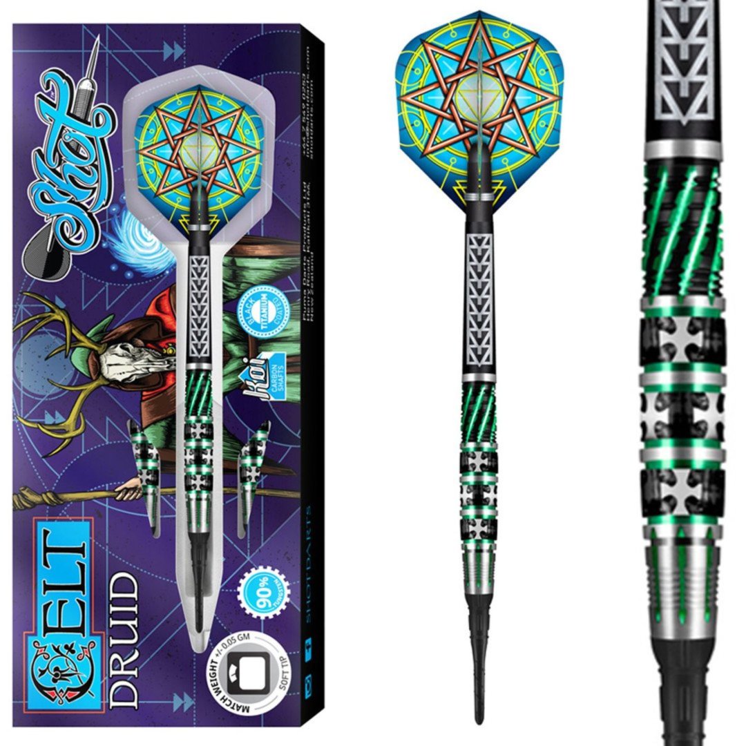 Miękkie rzutki Shot Celt Druid to wolframowe rzutki (90% wolframu) o absolutnie oszałamiającym wyglądzie. Unikalne żłobienia lufy są podkreślone czarną i zieloną farbą. Lufy są w komplecie z nylonowymi uchwytami i pałkami Shot.
