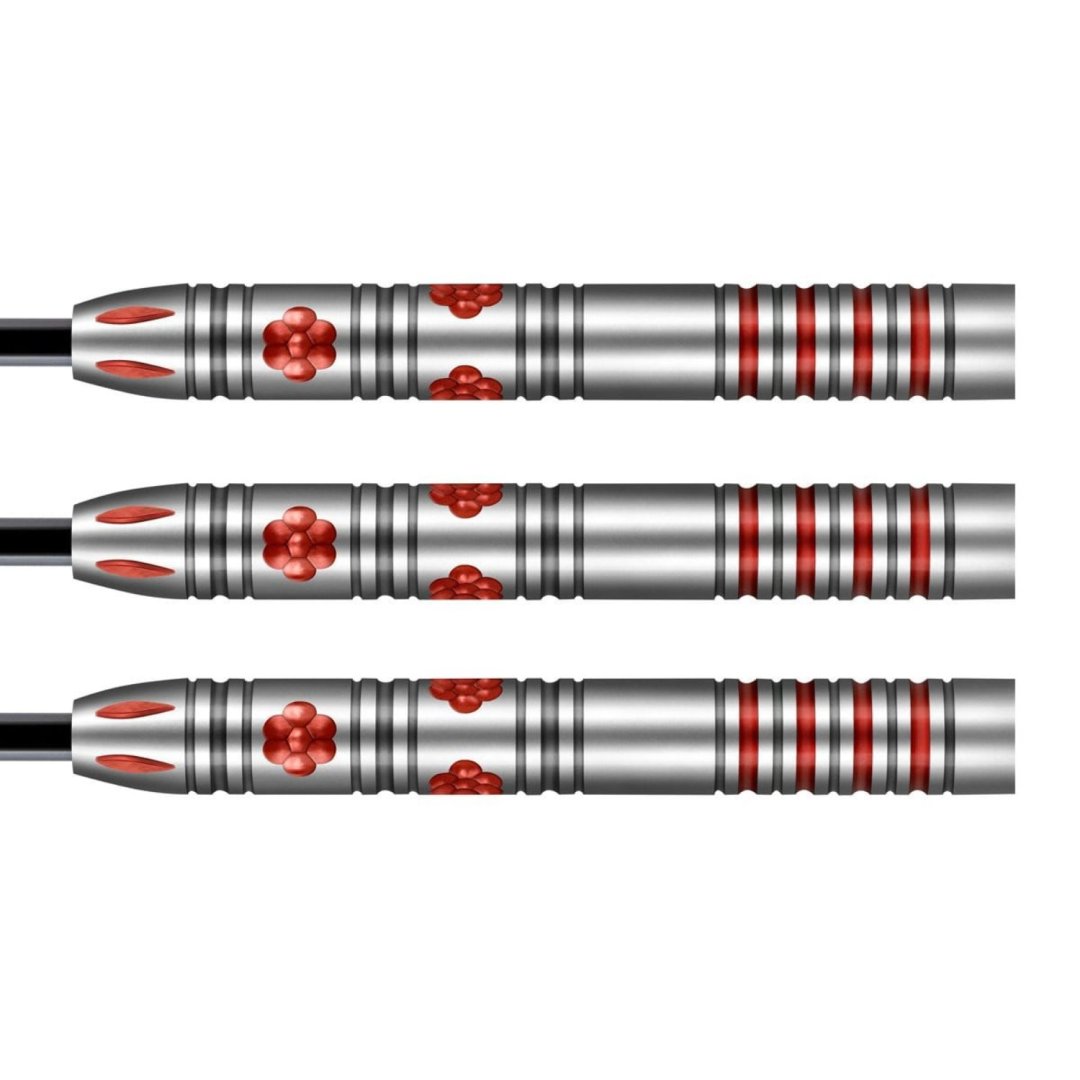 Stalowe lotki Shot Pro Series - Barbora Hospodárská to lotki wolframowe (90% wolframu) z lufami ozdobionymi czerwonymi kwiatami i czerwonymi rowkami.