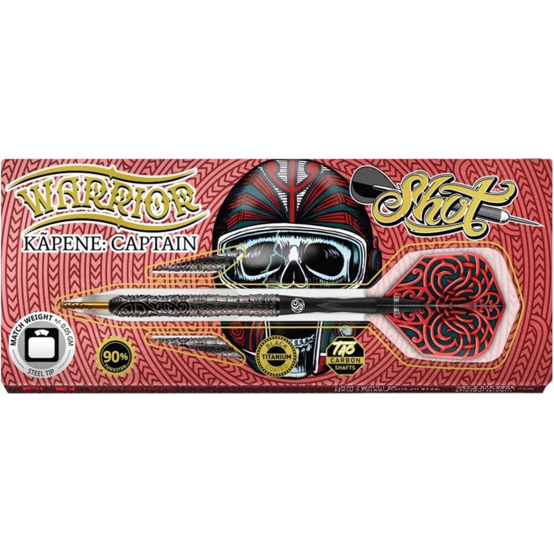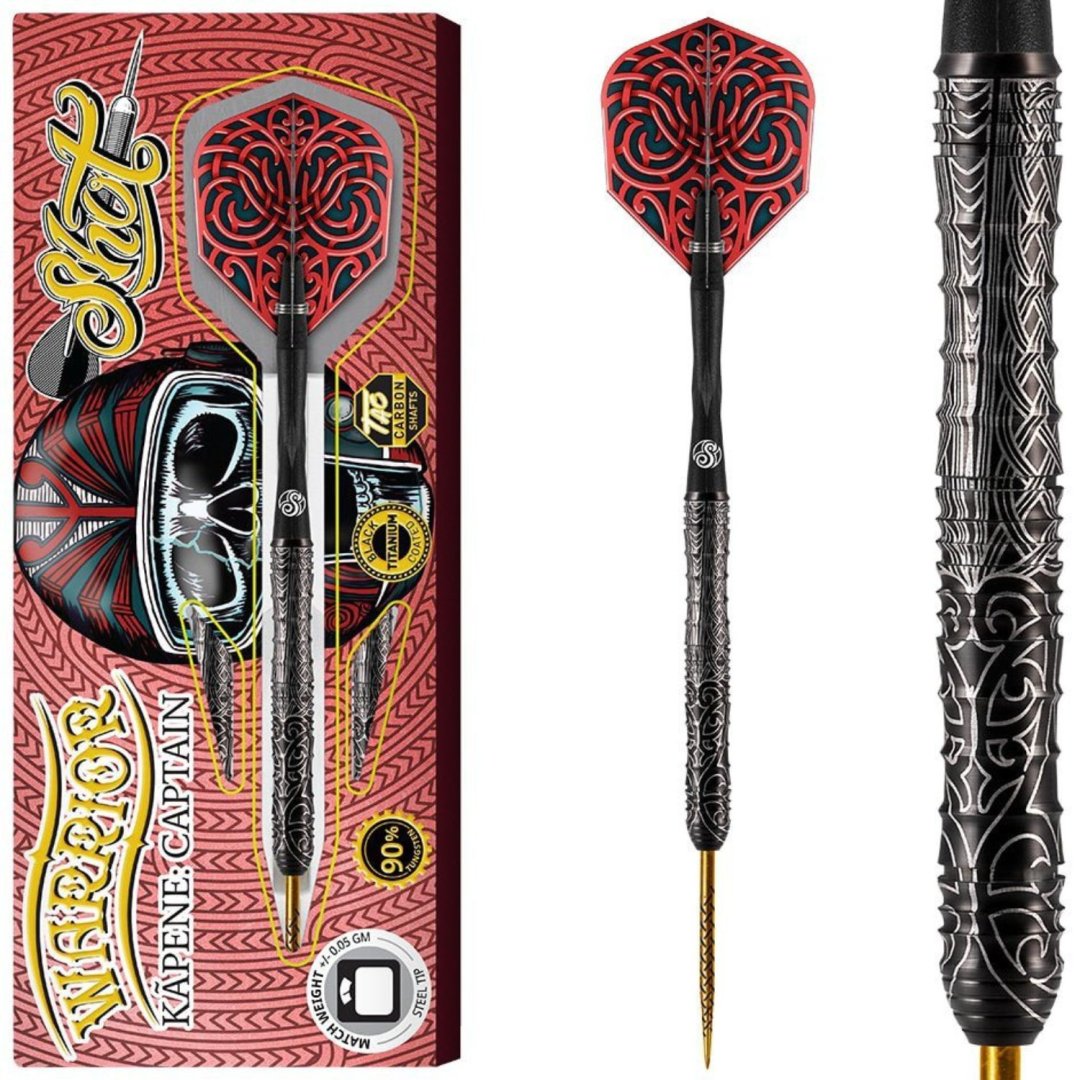 Stalowe rzutki Shot Warrior Kapene to wolframowe rzutki (90% wolframu) z oryginalnymi i absolutnie oszałamiającymi lufami. Lufy są uzupełnione nylonowymi uchwytami i listwami Shot.