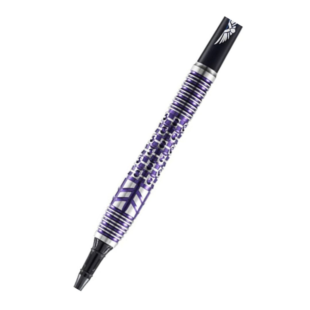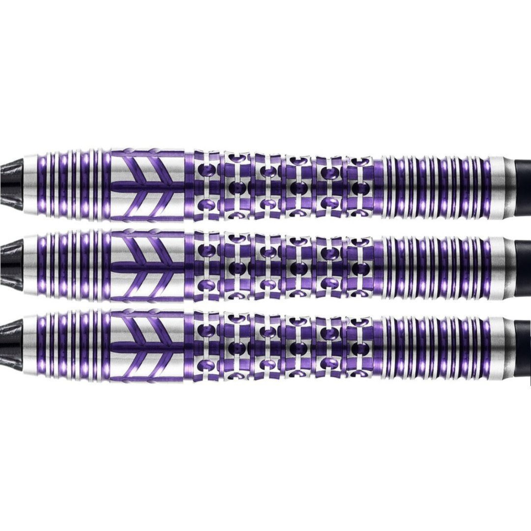 Miękkie rzutki Shot Viking Shield Maiden to wolframowe rzutki (90% wolframu) o unikalnym designie. Beczki mają oryginalne rowki zaznaczone na fioletowo.