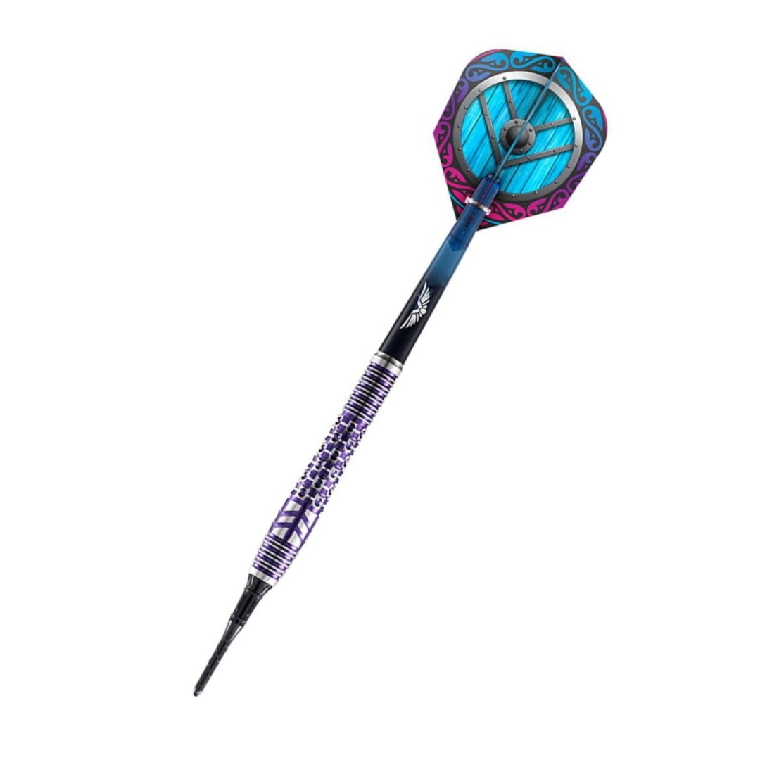 Miękkie rzutki Shot Viking Shield Maiden to wolframowe rzutki (90% wolframu) o unikalnym designie. Beczki mają oryginalne rowki podświetlone na fioletowo. Lufy są w komplecie z nylonowymi uchwytami i pałkami Shot.