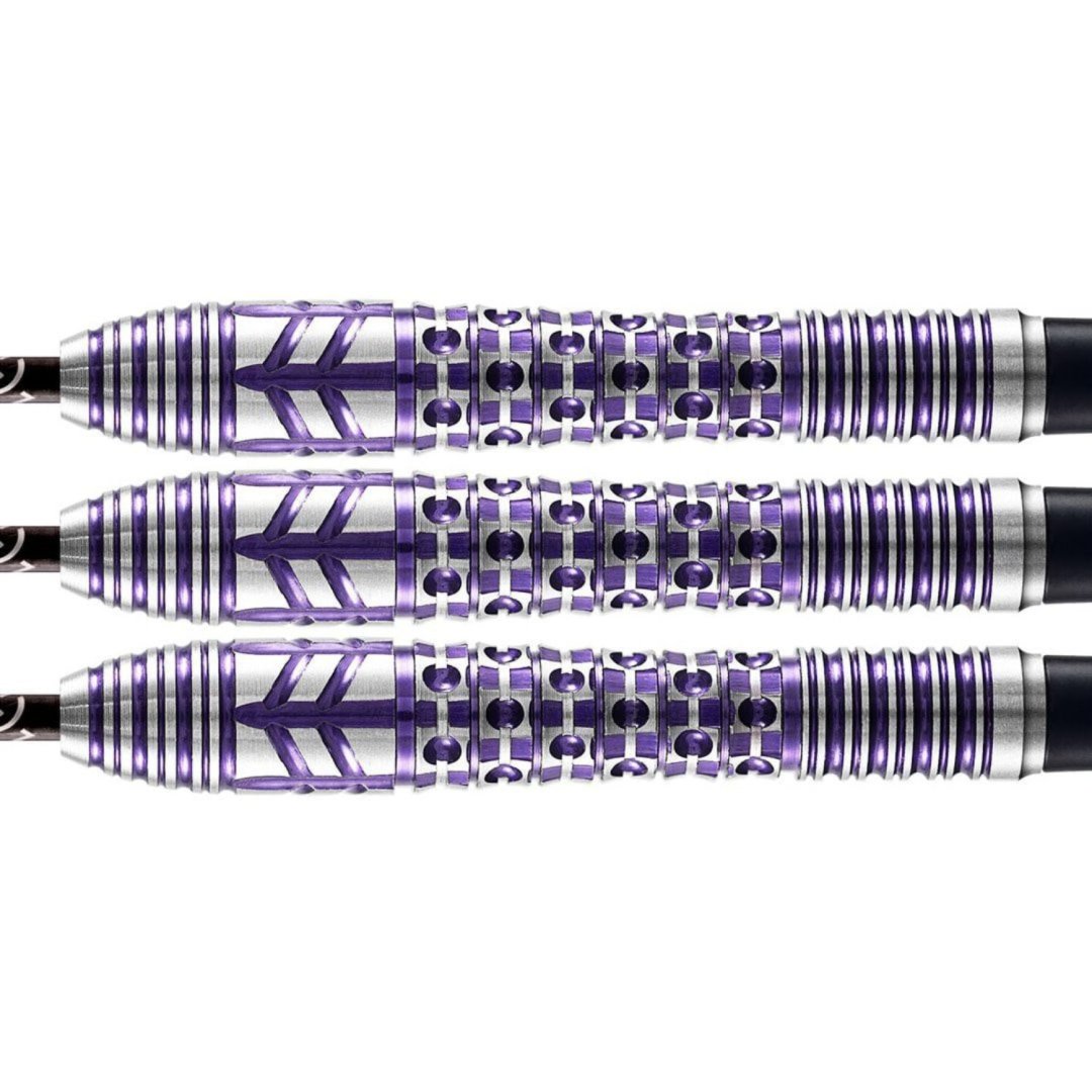 Stalowe rzutki Shot Viking Shield Maiden to wolframowe rzutki (90% wolframu) o unikalnym designie. Beczki mają oryginalne rowki zaznaczone na fioletowo.
