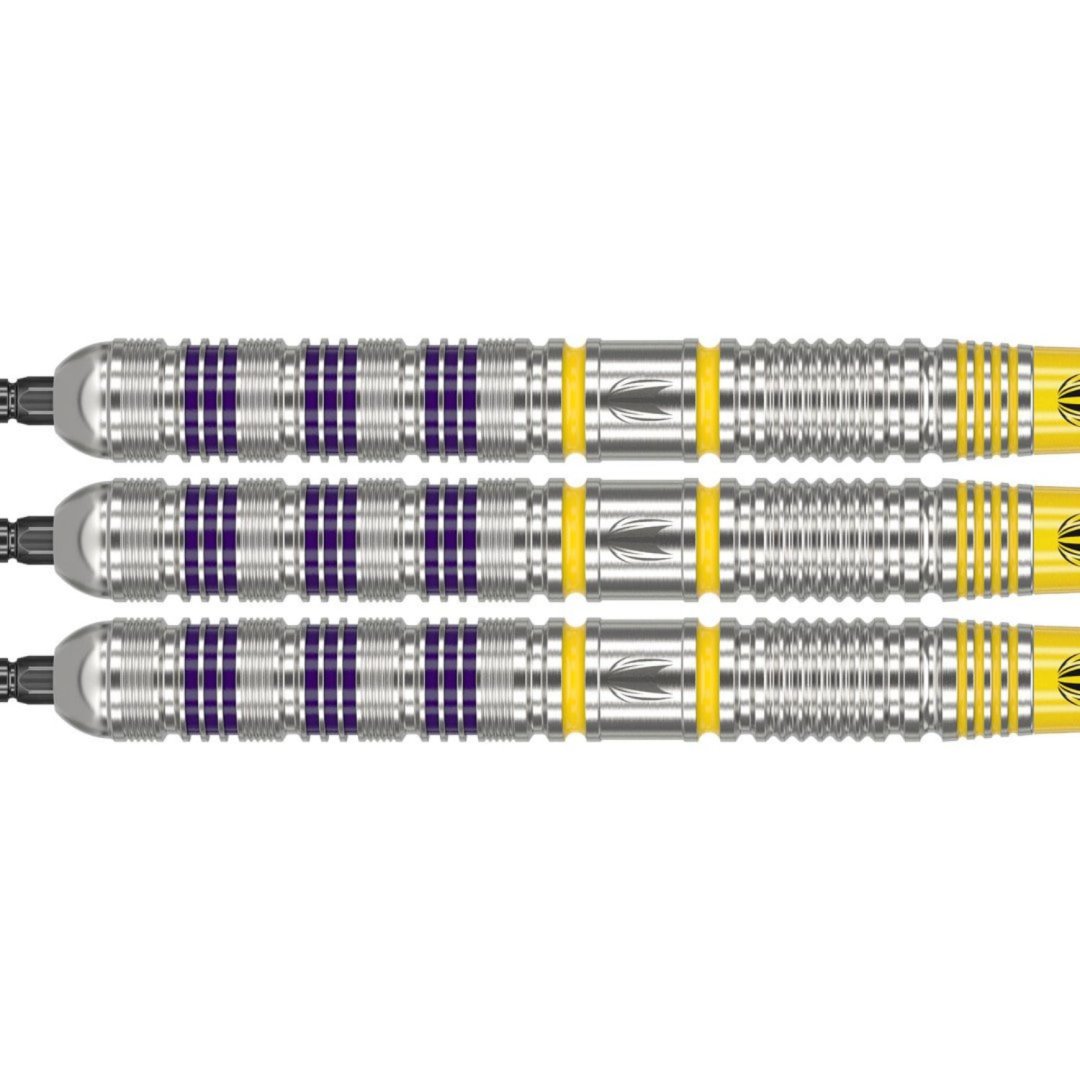 Luke Littler Loadout SP steel tungsten darts (90% wolframu) to rzutki z rowkowanymi lufami ozdobionymi fioletowymi i żółtymi paskami.