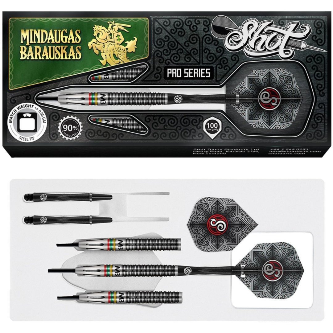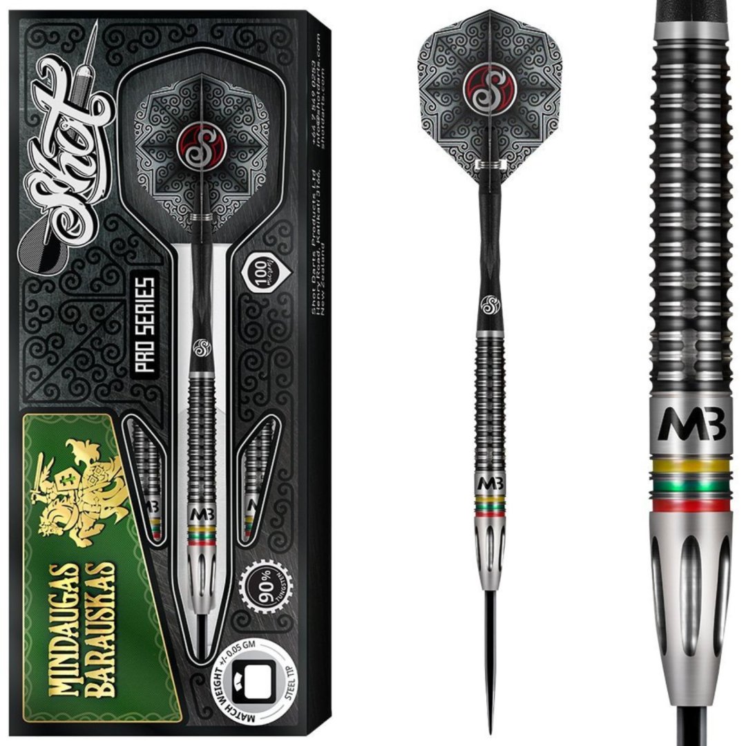 Miękkie rzutki Shot Pro Series Mindaugas Barauskas to wolframowe rzutki (90% wolframu) z czarnymi i srebrnymi beczkami ozdobionymi żółtymi, zielonymi i czerwonymi paskami oraz inicjałami MB. Lufy są uzupełnione nylonowymi uchwytami i pałkami Shot.