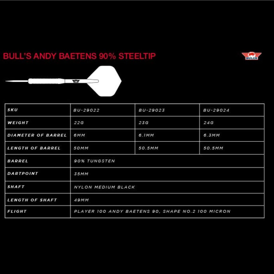 Stalowe lotki Andy Baetens to lotki wolframowe (90% wolframu) z gładkimi lufami bez rowków. Lufy są uzupełnione nylonowymi uchwytami i pałkami Andy Baetens.
