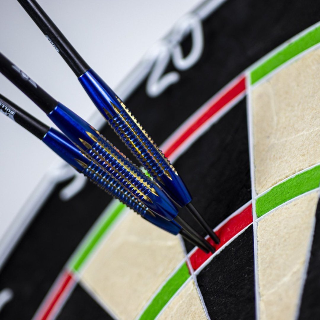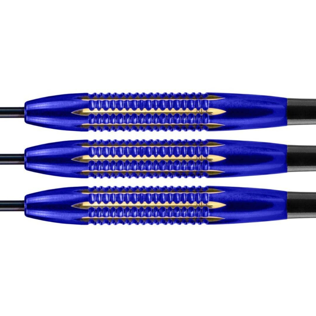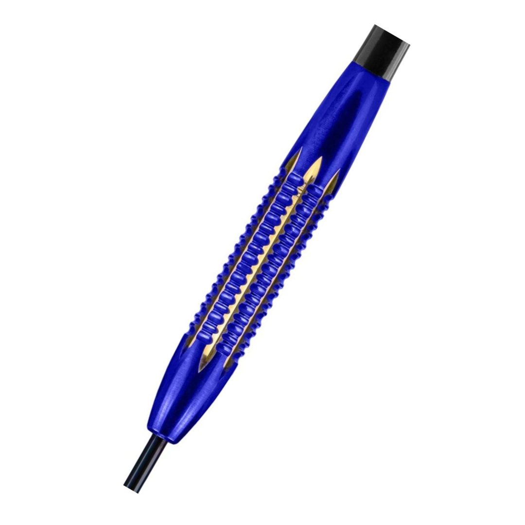 Stalowe lotki Mario Vandenbogaerde to mosiężne lotki z niebiesko-złotymi lufami.