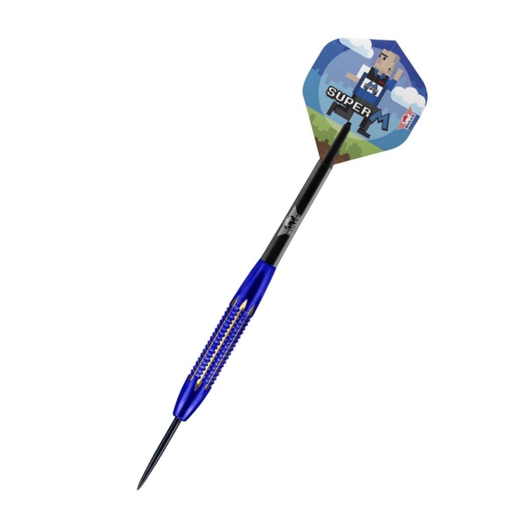 Stalowe lotki Mario Vandenbogaerde to mosiężne lotki z niebiesko-złotymi lufami. Lufy są uzupełnione nylonowymi uchwytami i pałkami dla graczy.