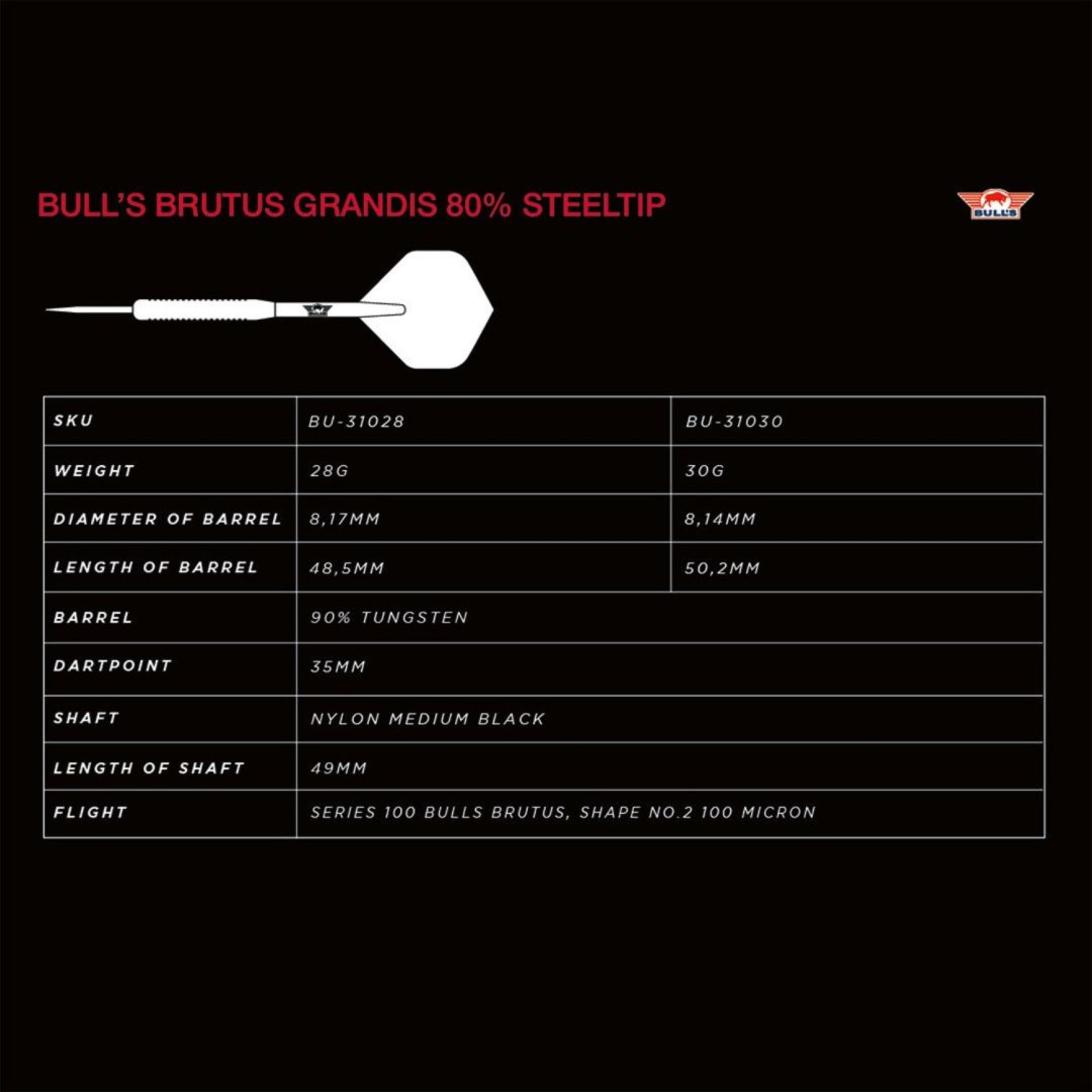 Stalowe rzutki Brutus to wolframowe rzutki (80% wolframu) o wysokiej gramaturze z chropowatymi lufami. Lufy są uzupełnione nylonowymi uchwytami i pałkami Brutus.
