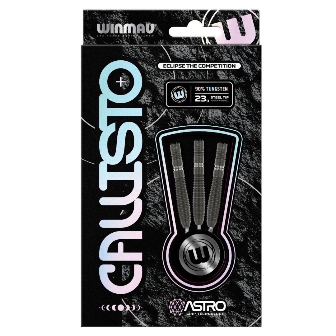 Stalowe lotki Winmau Callisto to lotki wolframowe (90% wolframu) z czarnymi lufami o ulepszonym, napylonym wykończeniu. Lufy są uzupełnione krótkimi uchwytami Vecta (W7025-116) i eskadrami Prism Delta (W6915-283).
