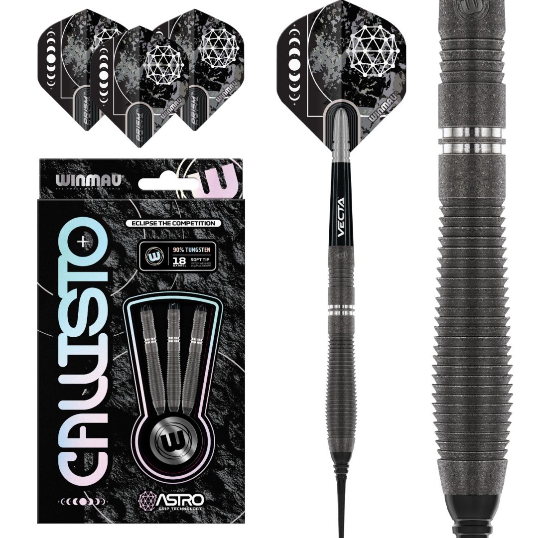 Miękkie lotki Winmau Callisto to lotki wolframowe (90% wolframu) z czarnymi lufami o ulepszonym, napylonym wykończeniu. Lufy są uzupełnione krótkimi uchwytami Vecta (W7025-116) i eskadrami Prism Delta (W6915-283).