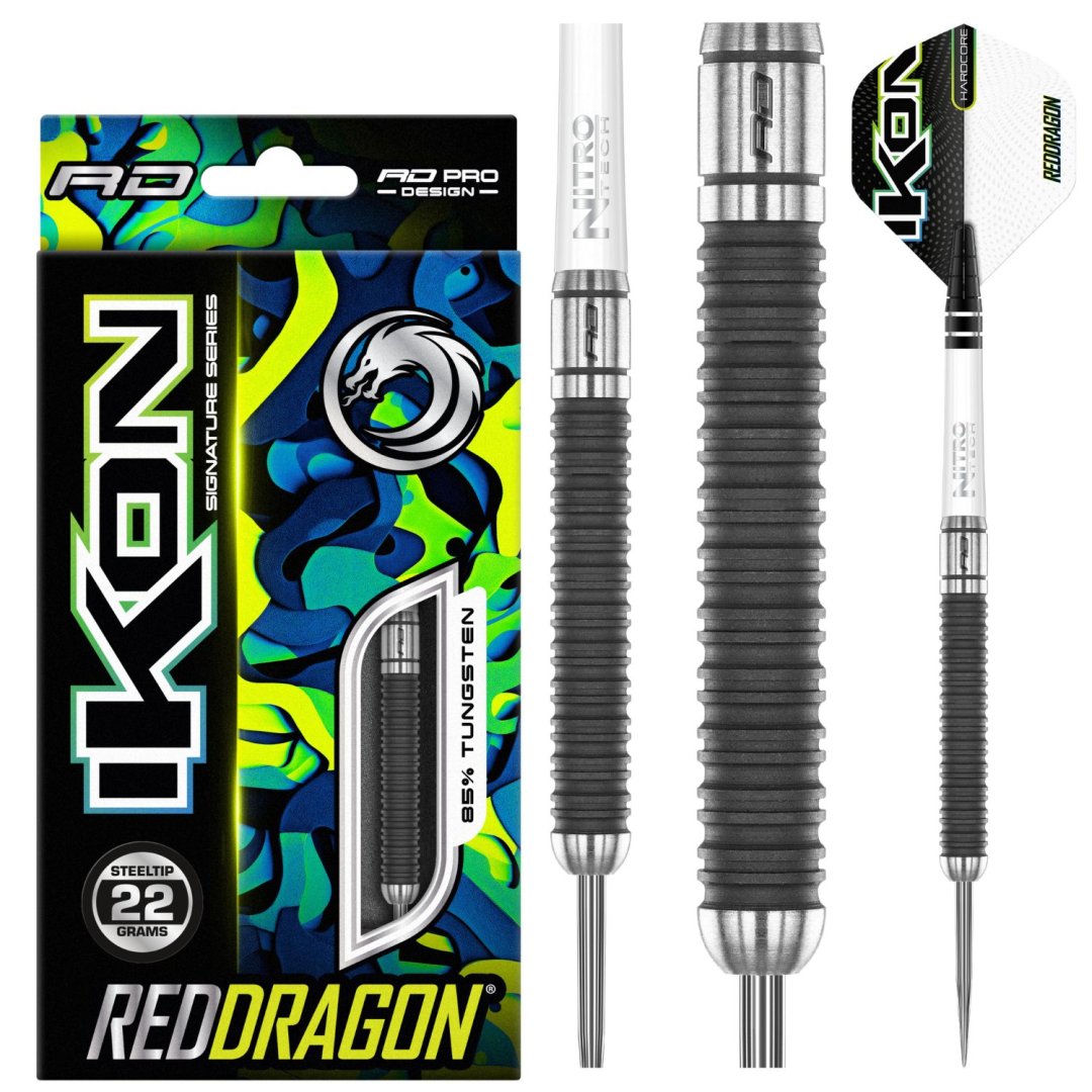 Stalowe lotki Red Dragon Ikon to lotki wolframowe (85% wolframu) z lufami, które są rowkowane na całej długości i mają szare wykończenie. Lufy są uzupełnione uchwytami Nitrotech i pałkami Hardcore Ikon.
