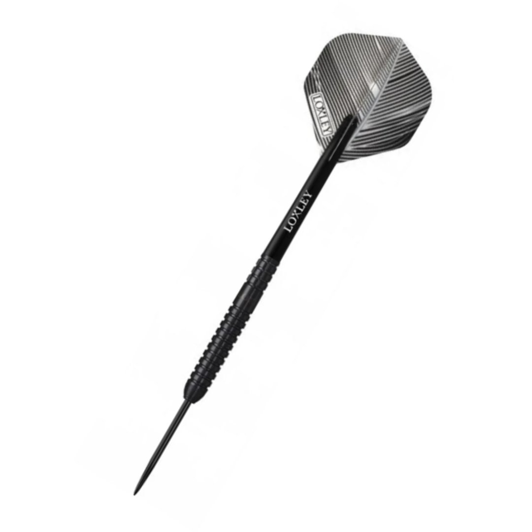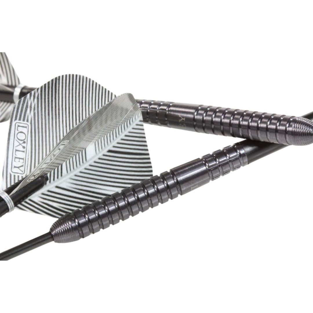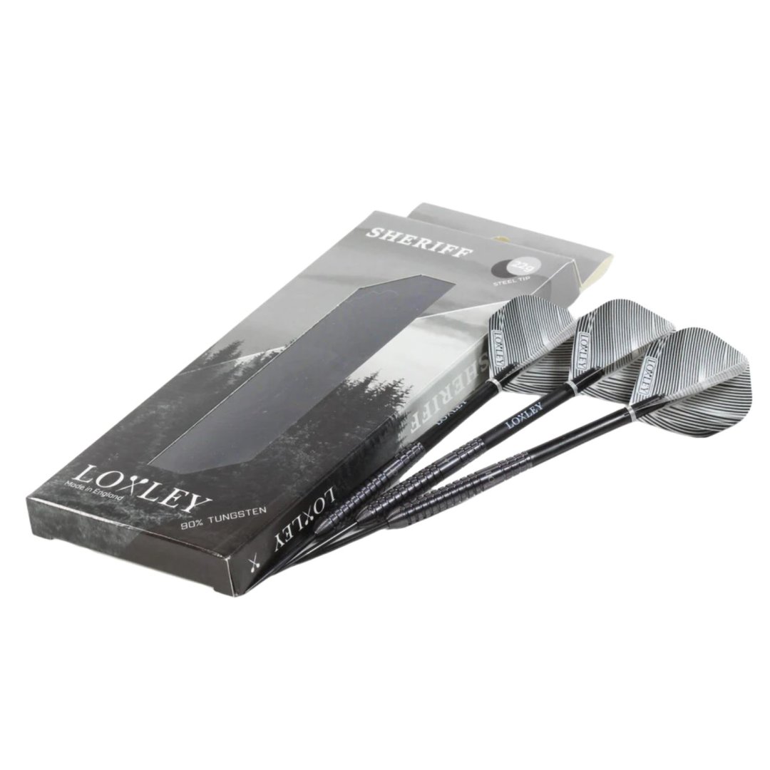 Stalowe lotki Loxley Sheriff to lotki wolframowe (90% wolframu) z czarnymi lufami.