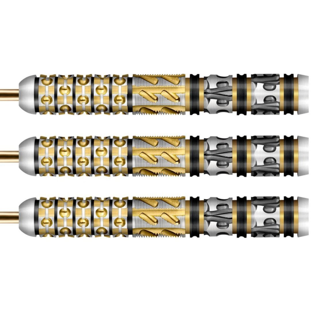 Stalowe rzutki Shot Viking Odin to wolframowe rzutki (95% wolframu) o absolutnie oszałamiającym wyglądzie. Beczki z unikalnymi rowkami, które są podkreślone złotem i czernią, sprawiają luksusowe wrażenie.