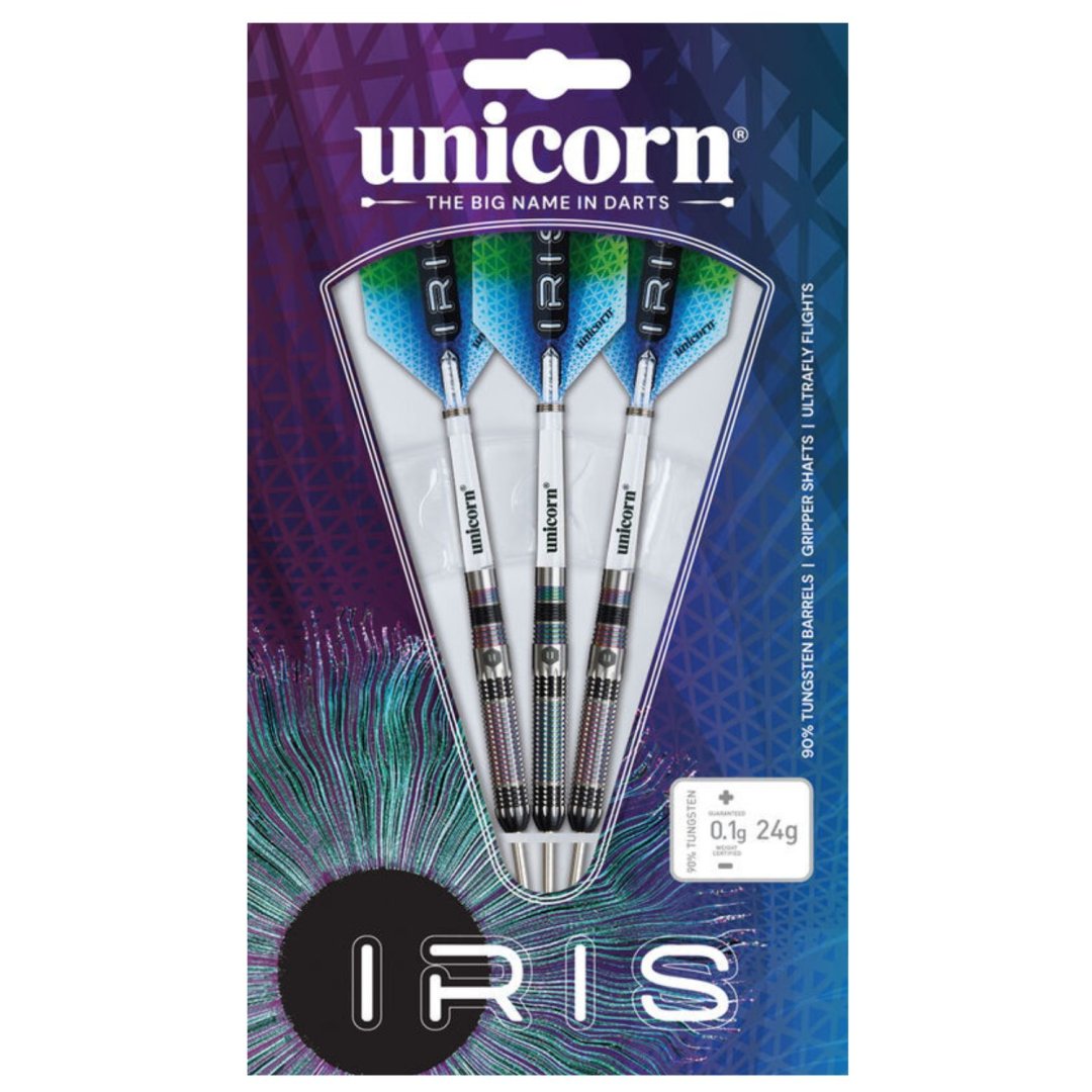 Unicorn Iris Steel Darts to wolframowe rzutki (90% wolframu) o oszałamiającym wyglądzie. Beczki mają unikalne rowki i kombinację kolorów, która nie ma sobie równych. Dwie lufy są wykończone w kolorze fioletowym, a jedna w kolorze niebiesko-zielonym. Uzupełnieniem luf są nylonowe uchwyty i eskadry Iris.