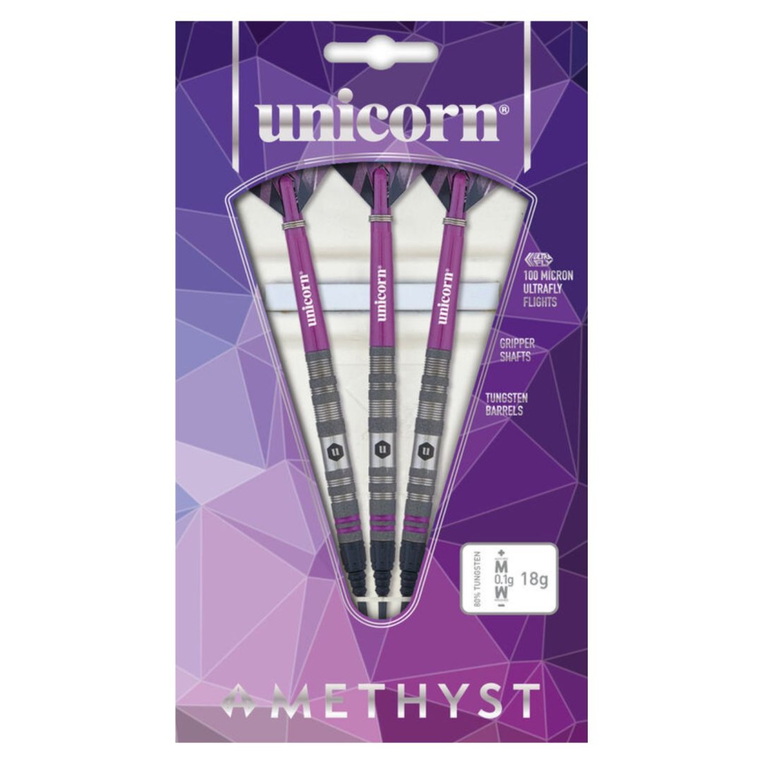 Miękkie rzutki Unicorn Amethyst to wolframowe rzutki (80% wolframu) o oszałamiającym wyglądzie. Beczki łączą drobne rowki, chropowatą powierzchnię i są ozdobione fioletowymi paskami. Uzupełnieniem beczek są nylonowe uchwyty i eskadry Amethyst.