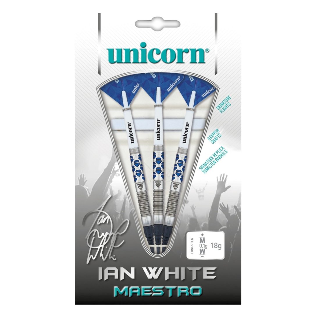 Miękkie rzutki Unicorn Maestro Ian White to wolframowe rzutki (90% wolframu) o unikalnym kształcie. Beczki są radełkowane z przodu i mają specjalne niebieskie rowki z tyłu. Lufy są uzupełnione nylonowymi uchwytami Gripper 3 i pałkami Ian Diamond White.