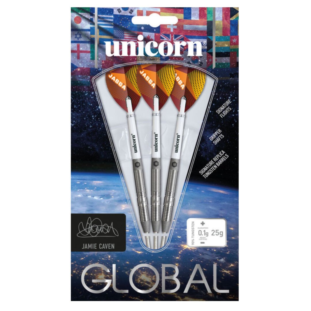 Stalowe lotki Unicorn Global Jamie Caven to lotki wolframowe (90% wolframu) z radełkowanymi lufami. Beczki są zakończone nylonowymi uchwytami Gripper 4 i listwami Jamie Caven.