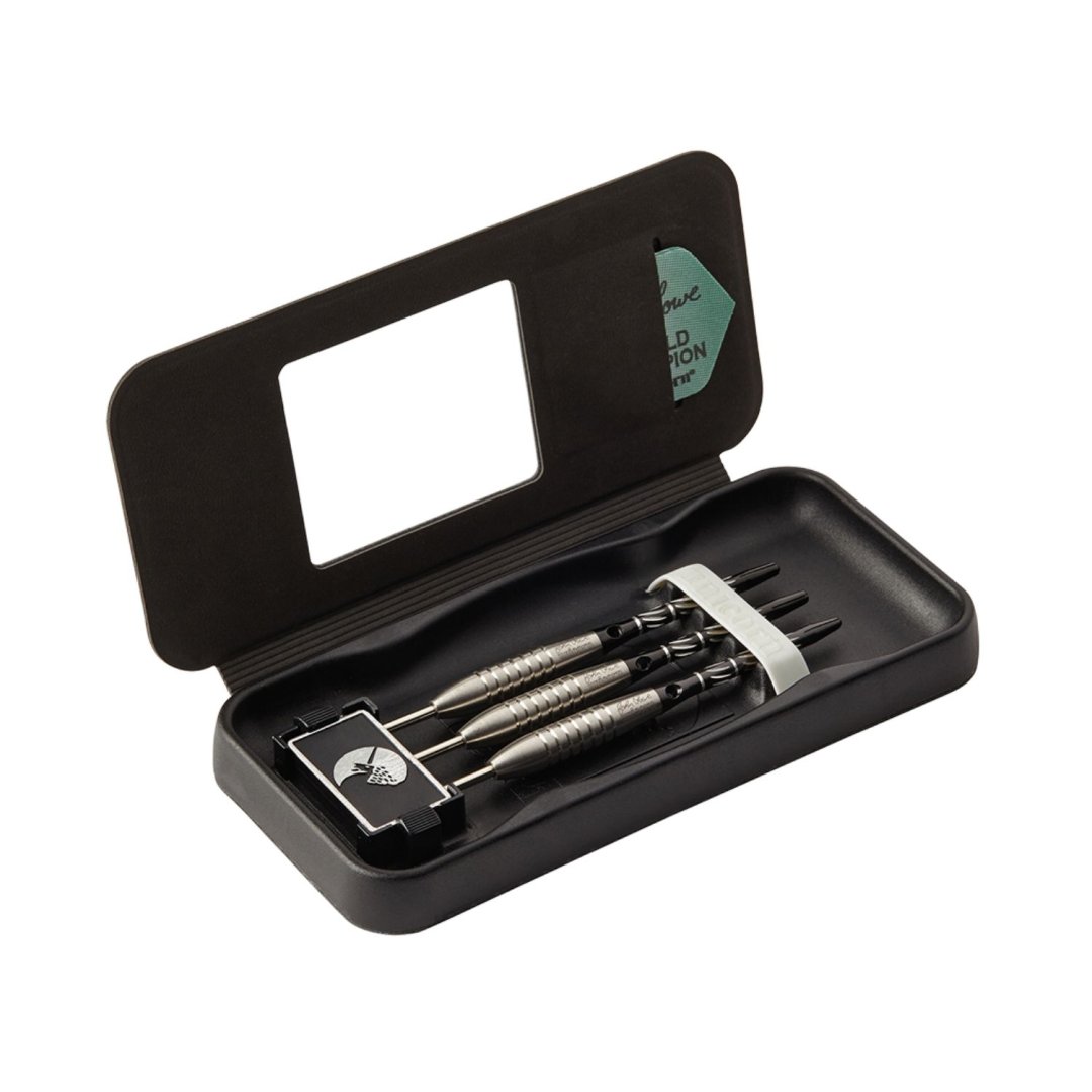 Stalowe lotki wolframowe (90% wolframu) z lufami ozdobionymi podpisem gracza. Lufy są uzupełnione nylonowymi uchwytami i pałkami John Lowe.