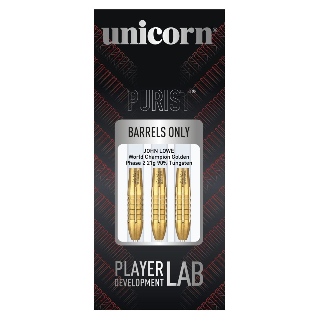 Stalowe lotki Unicorn Purist to wysokiej jakości wolframowe barrele (90% wolframu) w kolorze złotym. Beczki są ozdobione napisem Unicorn i podpisem gracza. Zestaw zawiera tylko beczki (bez uchwytów i pałek).