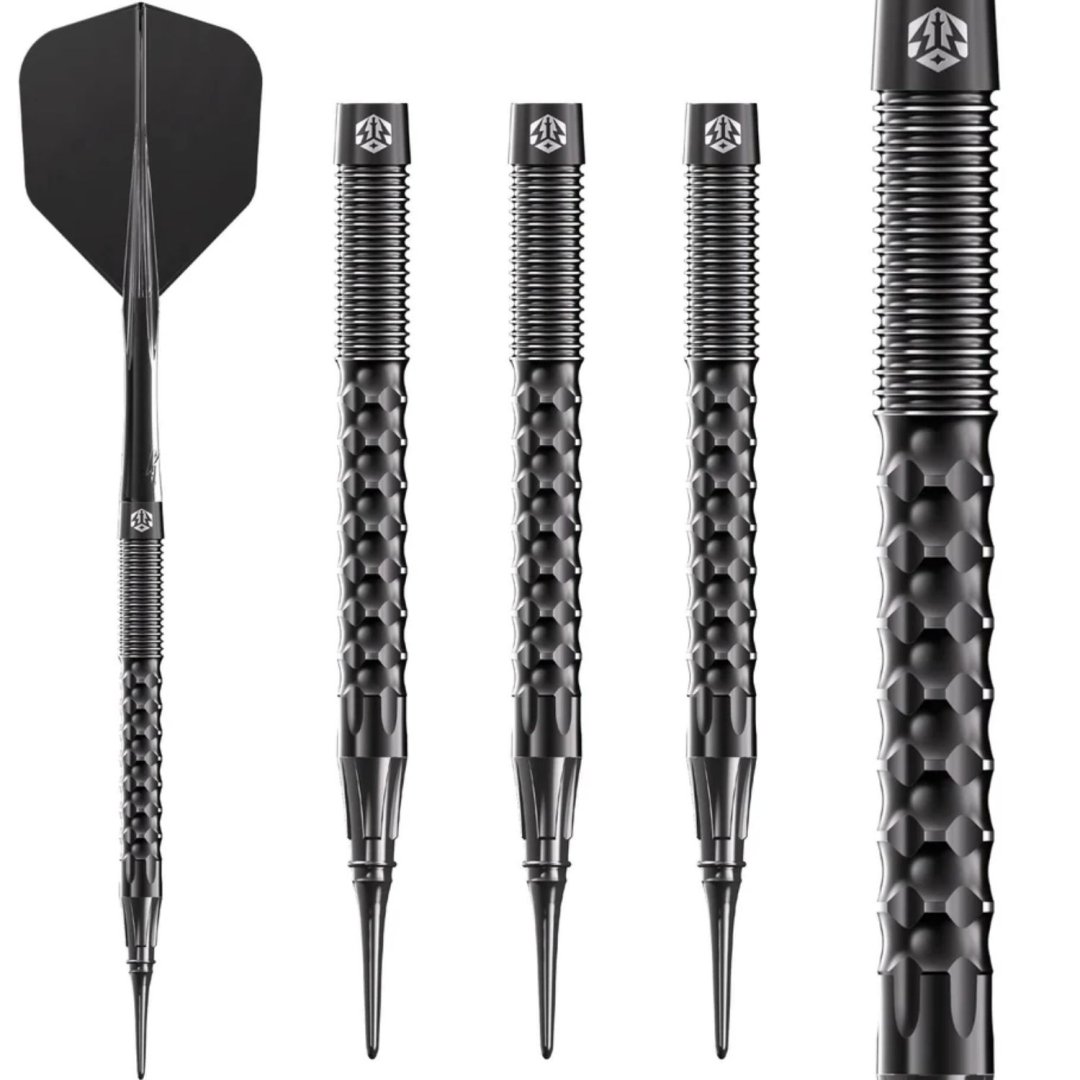Miękkie rzutki Caliburn Sword to wolframowe rzutki (95% wolframu) o oszałamiającym wyglądzie. Czarne beczki mają unikalne rowki i idealnie pasują do dłoni. Rzutki są wyposażone w plastikowe uchwyty.