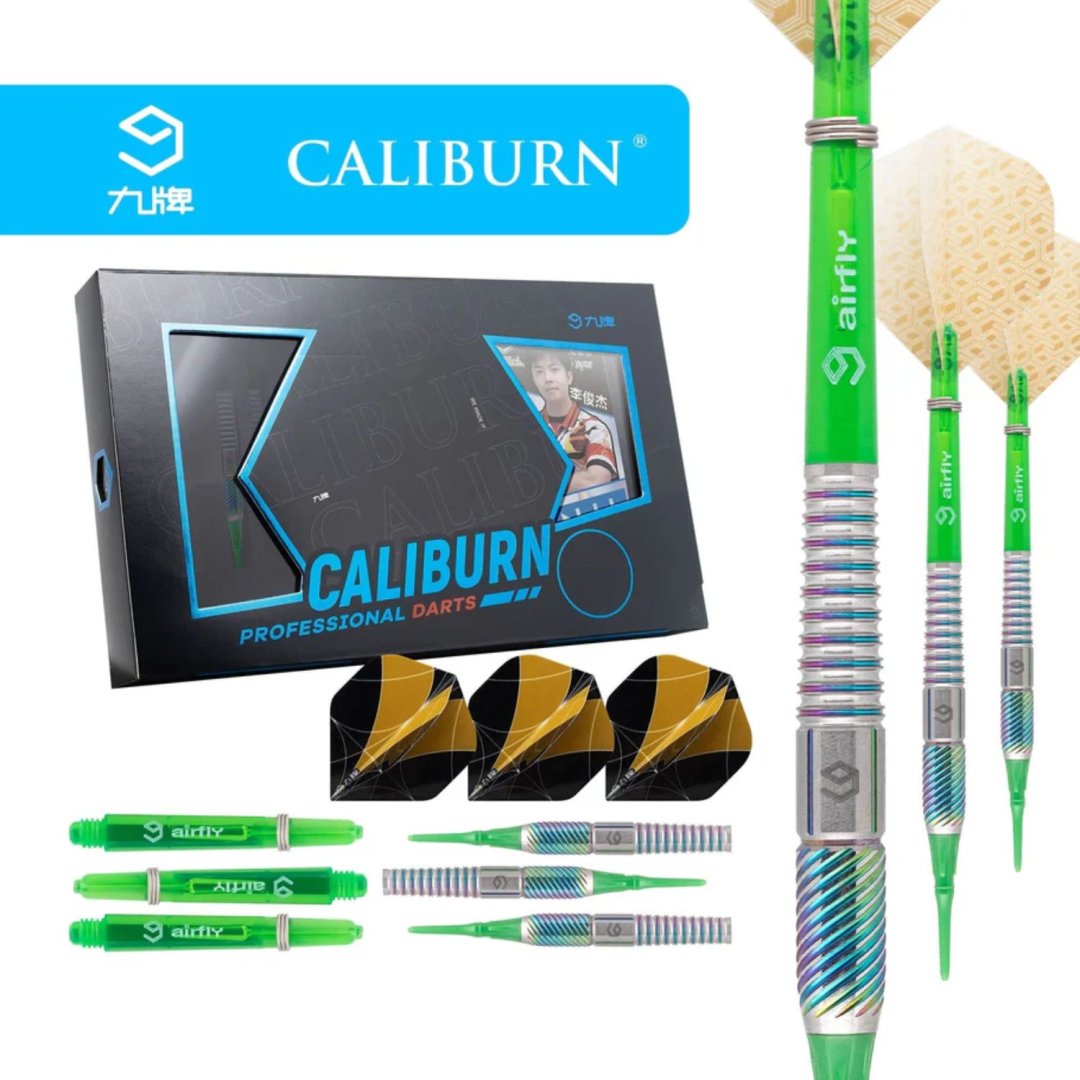 Miękkie lotki Caliburn Player to lotki wolframowe (90% wolframu) z lufami, które mają rowki podkreślone tęczowymi kolorami. Lufy są uzupełnione nylonowymi uchwytami i pałkami Caliburn.