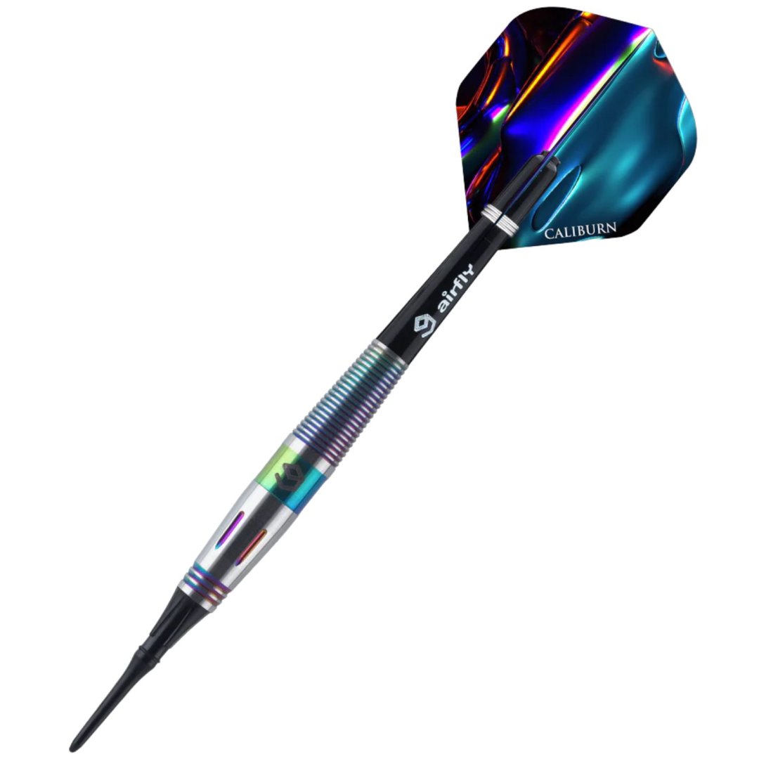 Miękkie rzutki Caliburn Element to wolframowe rzutki (90% wolframu) o oszałamiającym wyglądzie. Beczki mają rowki podkreślone kolorami tęczy.