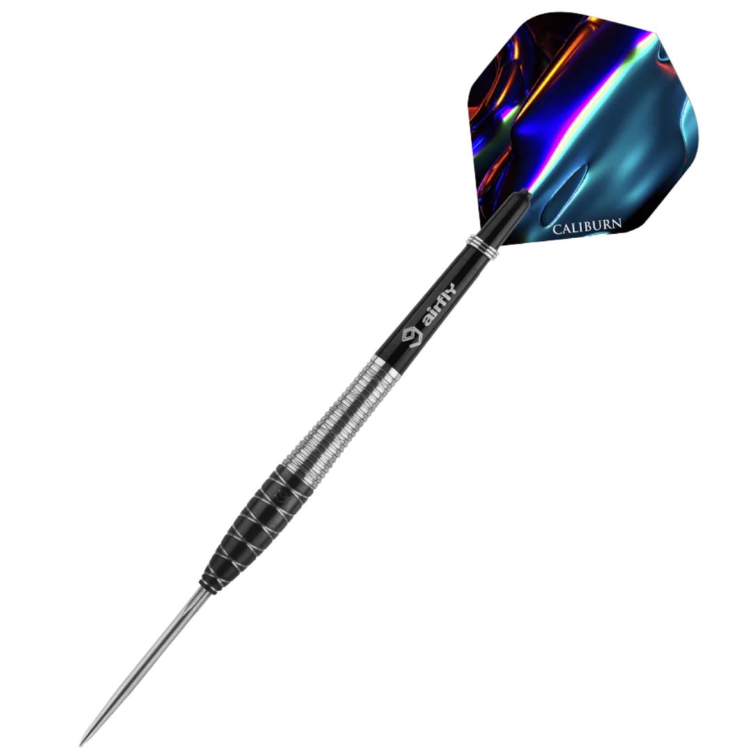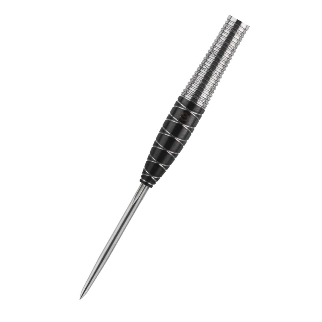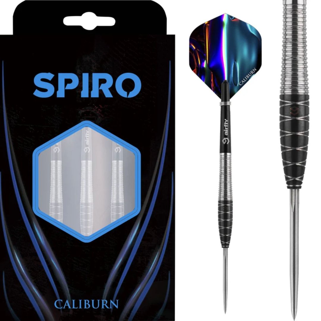 Stalowe rzutki Caliburn Spiro to wolframowe rzutki (90% wolframu) z czarnymi i srebrnymi lufami w oryginalnym designie. Lufy są uzupełnione nylonowymi uchwytami i pałkami Caliburn. Rzutki posiadają system wymiennych końcówek Caliburn. Klucz do wymiany końcówek Caliburn (X1997) NIE jest dołączony do zestawu.