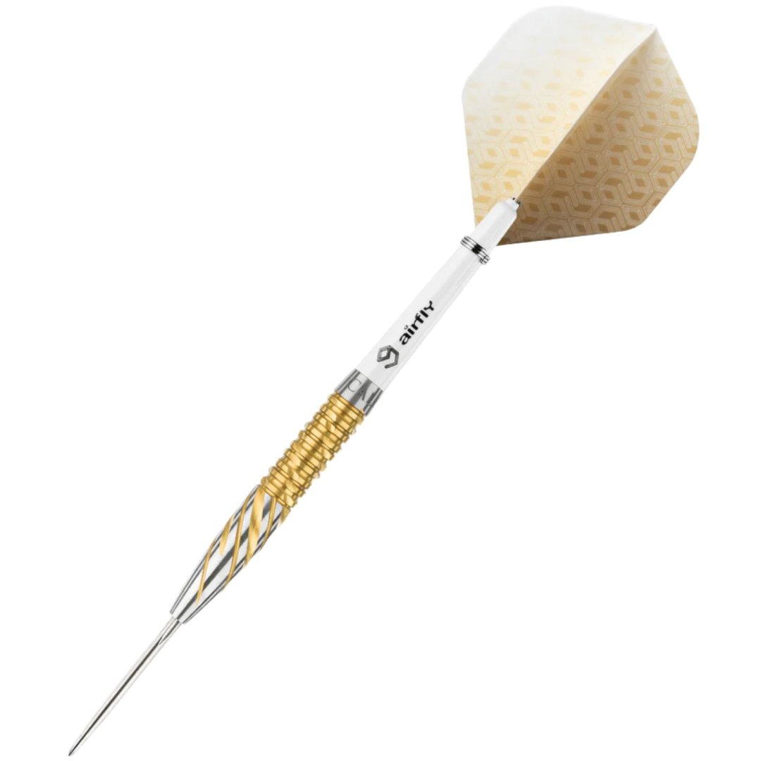 Stalowe lotki Caliburn Nexus to lotki wolframowe (95% wolframu) o oszałamiającym wyglądzie. Beczki mają rowki podkreślone złotem.