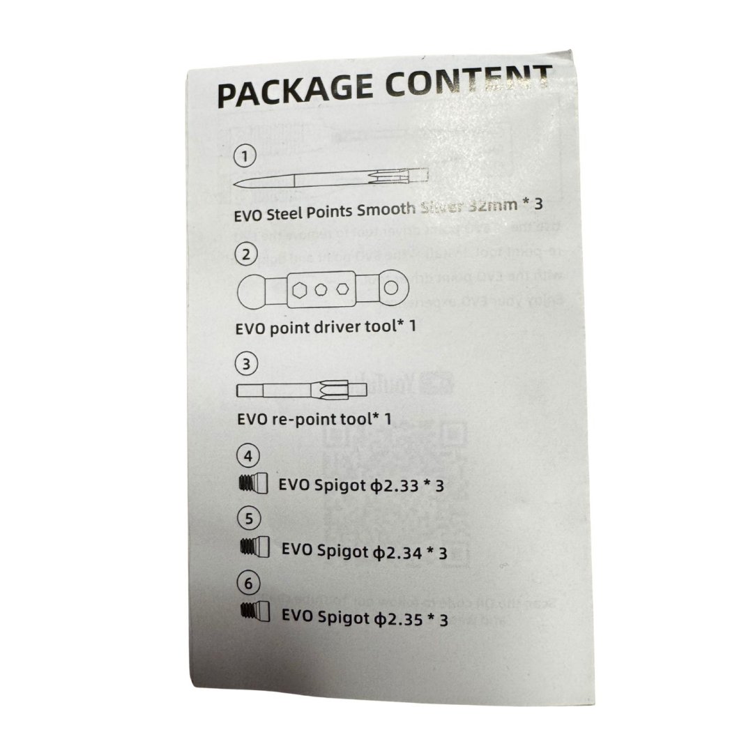 Caliburn Starter Kit to idealny zestaw narzędzi potrzebnych do wymiany systemu wymiennych ostrzy Caliburn. Zestaw zawiera 1 zestaw wymiennych szpiców Caliburn Smooth Silver 32 mm (tj. 3 sztuki), 1x narzędzie do wymiany szpiców (EVO Point Driver Tool X2910), 1x narzędzie do montażu szpiców (EVO Repoint Tool X2969) oraz 3 zestawy szpiców (o średnicy 2,33, 2,34 i 2,35 mm). Użyj narzędzia do wbijania szpilek, aby włożyć szpilkę do lufy. Następnie użyj narzędzia do wymiany czopów, aby włożyć czop. Montaż nowych kolców nigdy nie był tak prosty.