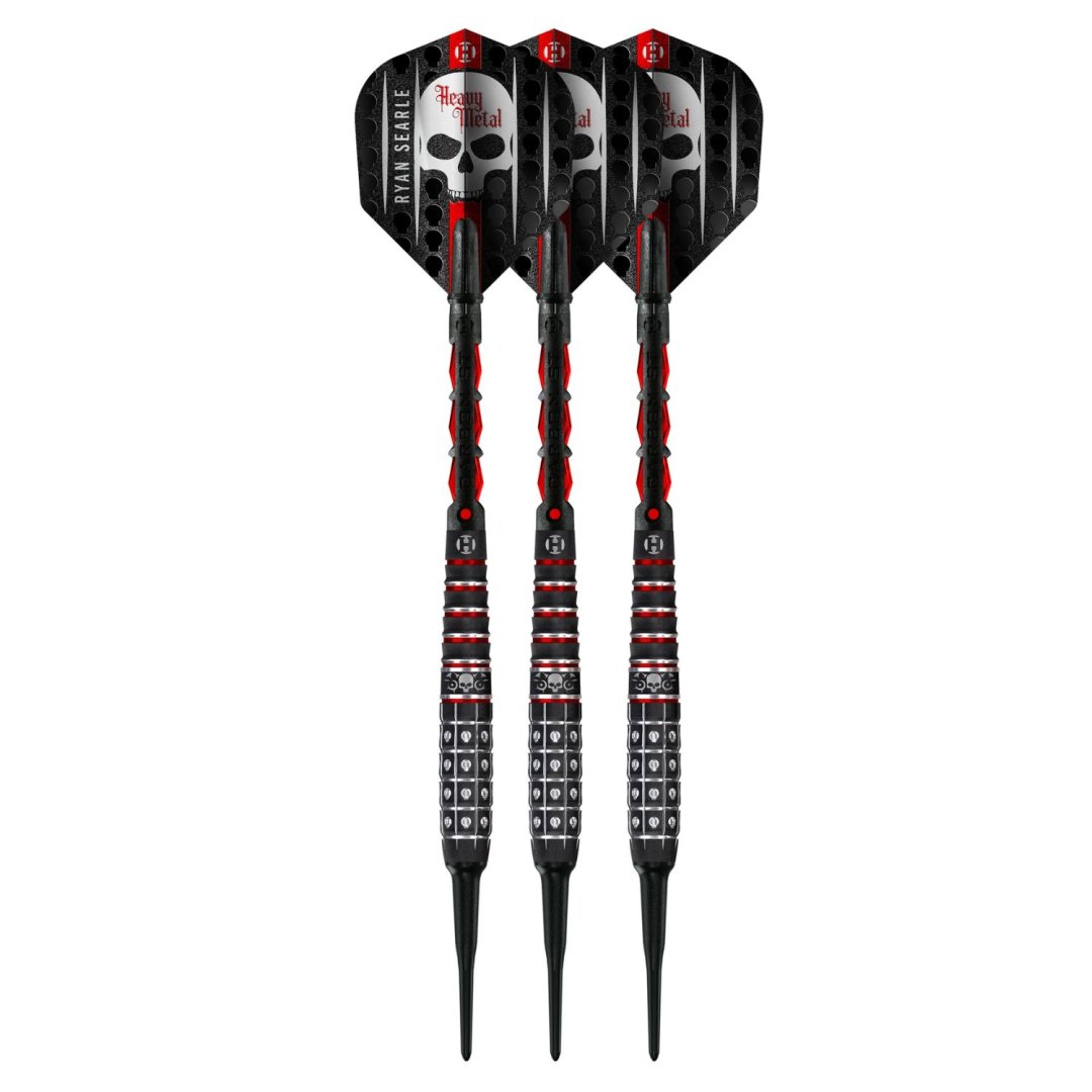 Miękkie rzutki Harrows Ryan Searle - Heavy Metal - Series 3 to wolframowe rzutki (90% wolframu) o doskonałym designie. Czarne beczki mają rowki podświetlone na czerwono i srebrno, a na środku znajduje się motyw czaszki. Czarno-czerwony design rzutek jest po prostu rozbrajający! Lufy są w komplecie z uchwytami Carbon ST i pałkami Ryan Searle.