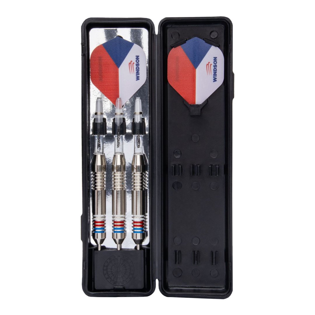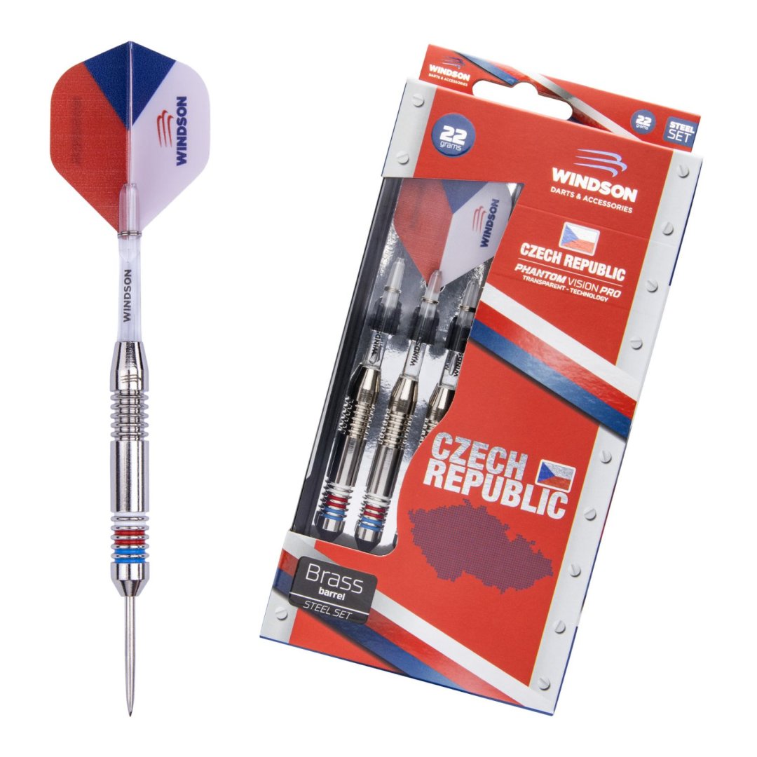 Stalowe rzutki Windson Czech to mosiężne rzutki z lufami w czerwone, niebieskie i białe paski. Projekt czerpie inspirację z czeskiej flagi. Lufy są uzupełnione nylonowymi uchwytami i listwami Windson.