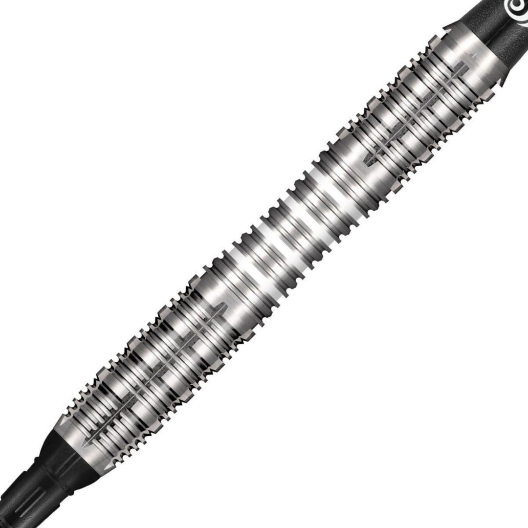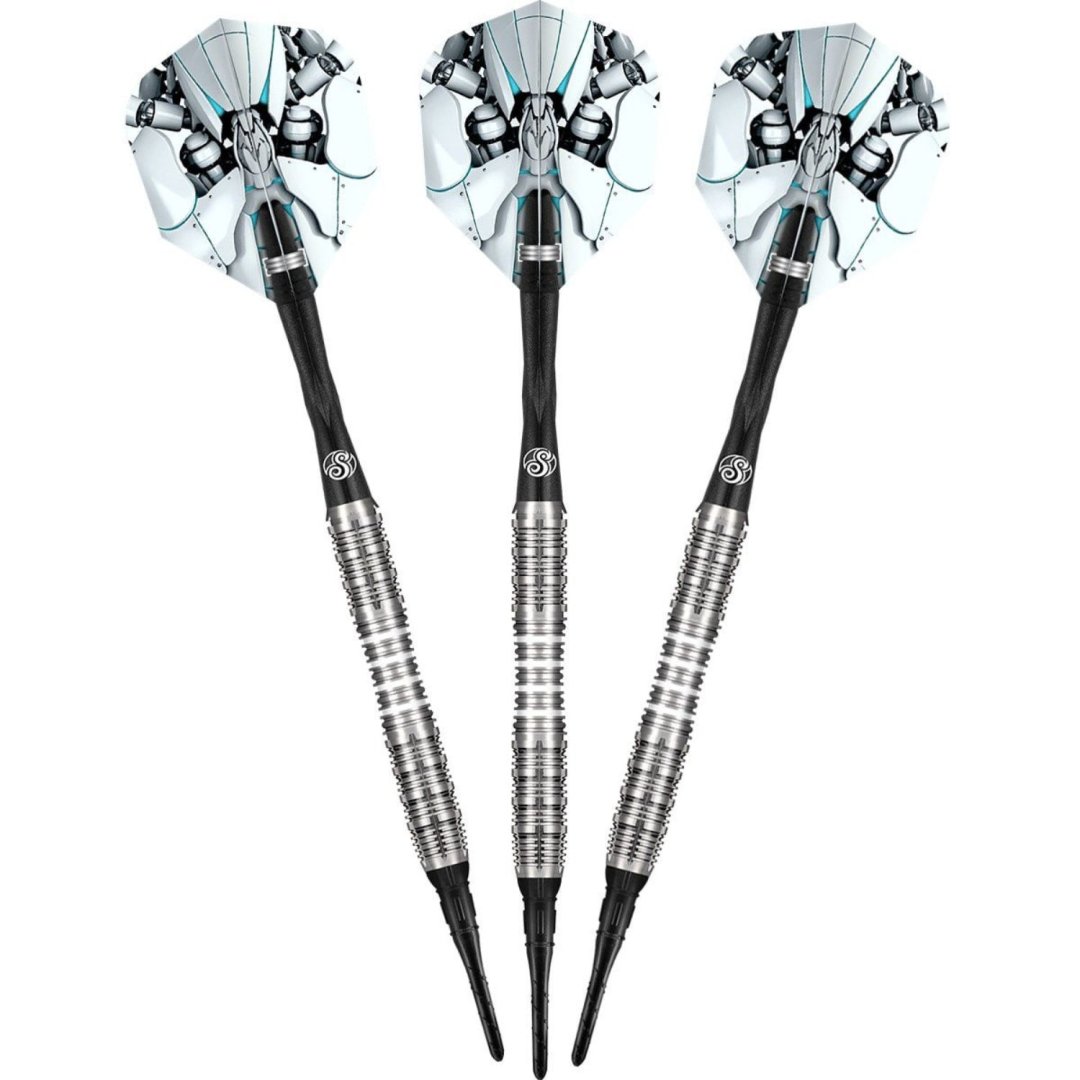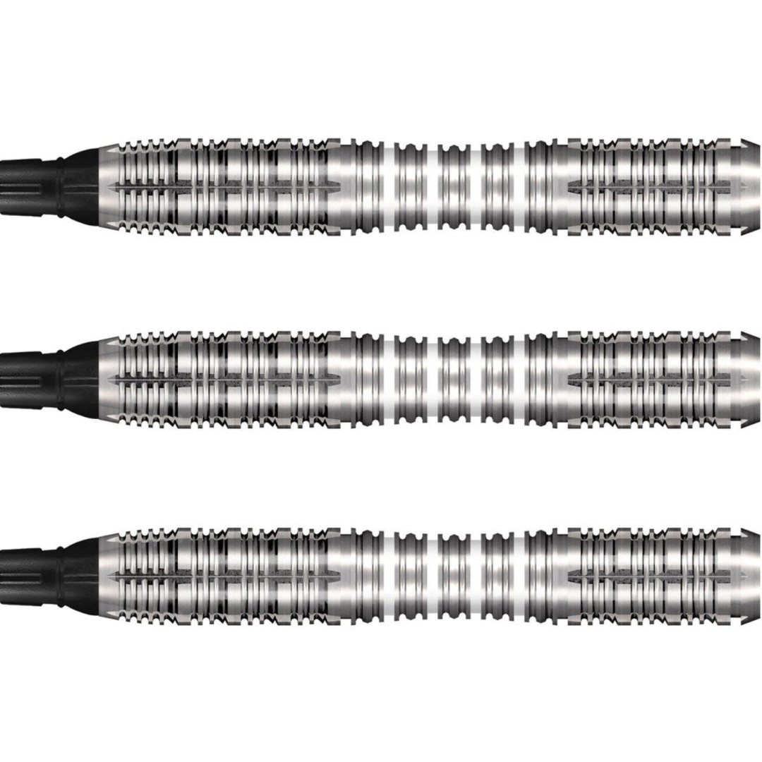 Miękkie lotki Shot AI Scorpula to lotki wolframowe (90% wolframu) z rowkowanymi lufami, które mają białe paski w środkowej części.