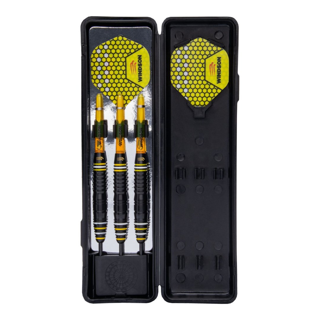 Stalowe rzutki Windson Bee Zone to mosiężne rzutki z czarnymi lufami ozdobionymi żółtymi i białymi paskami. Lufy są w komplecie z nylonowymi uchwytami i pałkami Windson.