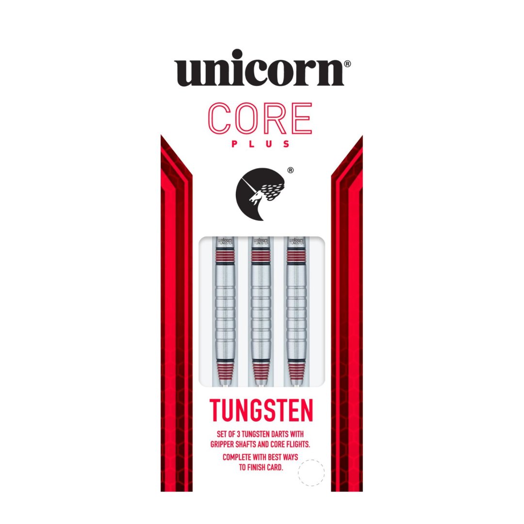 Unicorn Core Plus Tungsten Steel Darts to wolframowe rzutki (80% wolframu) z lufami ozdobionymi czerwonymi i czarnymi paskami z przodu i z tyłu. Lufy są uzupełnione uchwytami Gripper i uchwytami Unicorn.
