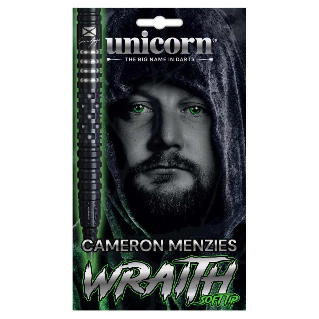 Miękkie rzutki Unicorn Wraith Cameron Menzies to wolframowe rzutki (90% wolframu) z czarnymi lufami. Lufy są uzupełnione zielonymi nylonowymi uchwytami Gripper 4, łatami Wraith i końcówkami Epic.