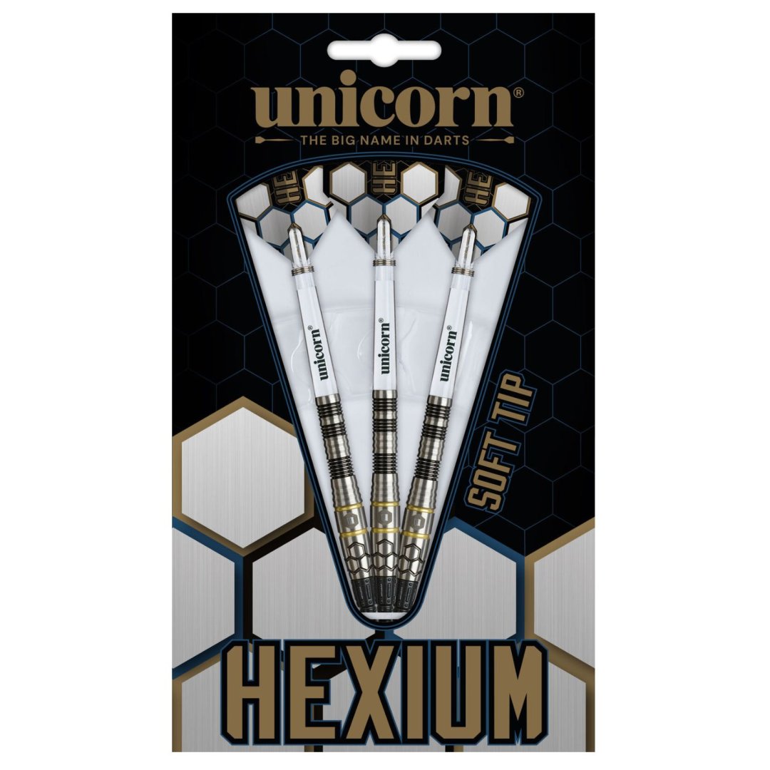 Miękkie rzutki Unicorn Hexium to wolframowe rzutki (90% wolframu) z beczkami o oryginalnym designie. Przednia część rzutki oferuje bardziej miękki uchwyt, który ułatwia ułożenie palców i płynniejsze rzucanie. Uchwyt i nacięcia Hexium odzwierciedlają japoński styl i innowacyjność oraz posiadają elegancką czarną powłokę PVD, którą podkreślają dwa złote pierścienie. Lufy są uzupełnione nylonowymi uchwytami Gripper 4, ostrzami Ultrafly i końcówkami Epic.