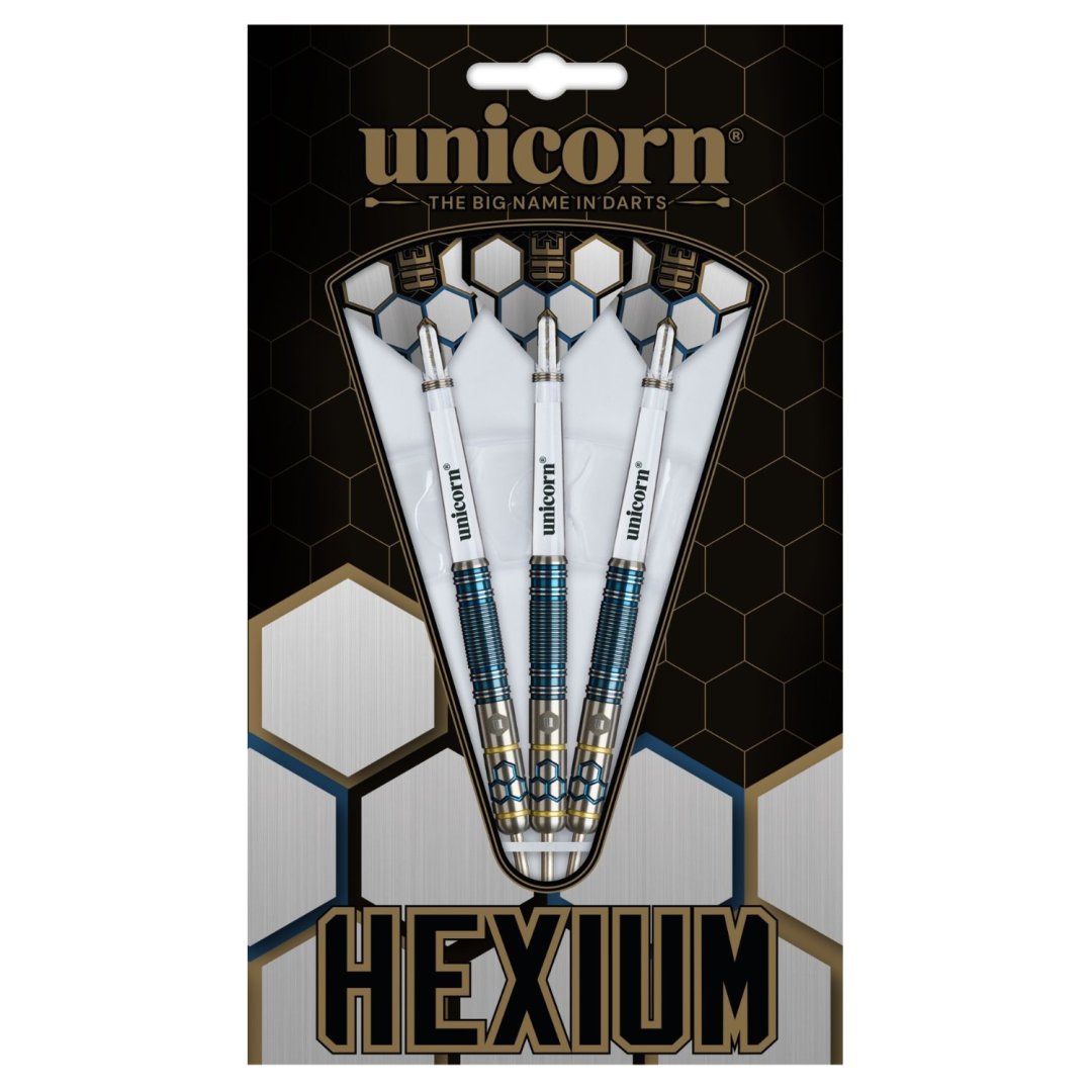 Stalowe rzutki Unicorn Hexium to wolframowe rzutki (90% wolframu) z lufami o oryginalnym designie. Rzutki Hexium łączą w sobie skomplikowane wykonanie z odważnym designem inspirowanym Japonią. Jest to idealne rozwiązanie dla zaawansowanych graczy, którzy preferują chwyt typu backhand. Misternie zaprojektowany uchwyt Hexium zapewnia spójne ułożenie palców i płynniejsze uwalnianie. Piękna niebieska powłoka PVD w połączeniu ze złotymi paskami dodaje rzutce elegancji. Lufy są uzupełnione nylonowymi uchwytami Gripper 4 i pałkami Ultrafly.