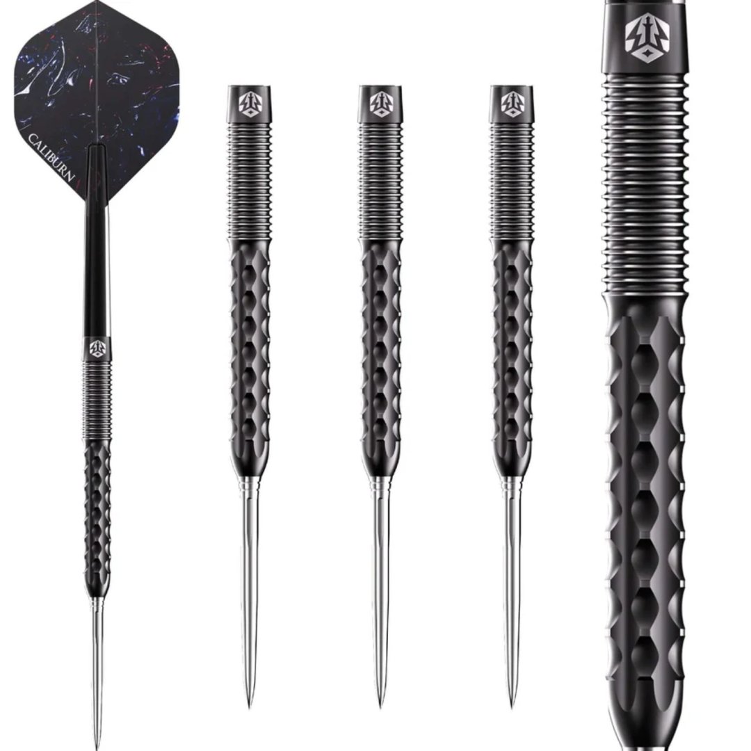 Stalowe lotki Caliburn Sword to lotki wolframowe (95% wolframu) z czarnymi lufami o oszałamiającym wyglądzie. Lufy są uzupełnione nylonowymi uchwytami i pałkami Caliburn. Rzutki posiadają system wymiennych punktów Caliburn. W zestawie znajduje się również klucz do wymiany końcówek Caliburn (X1997).