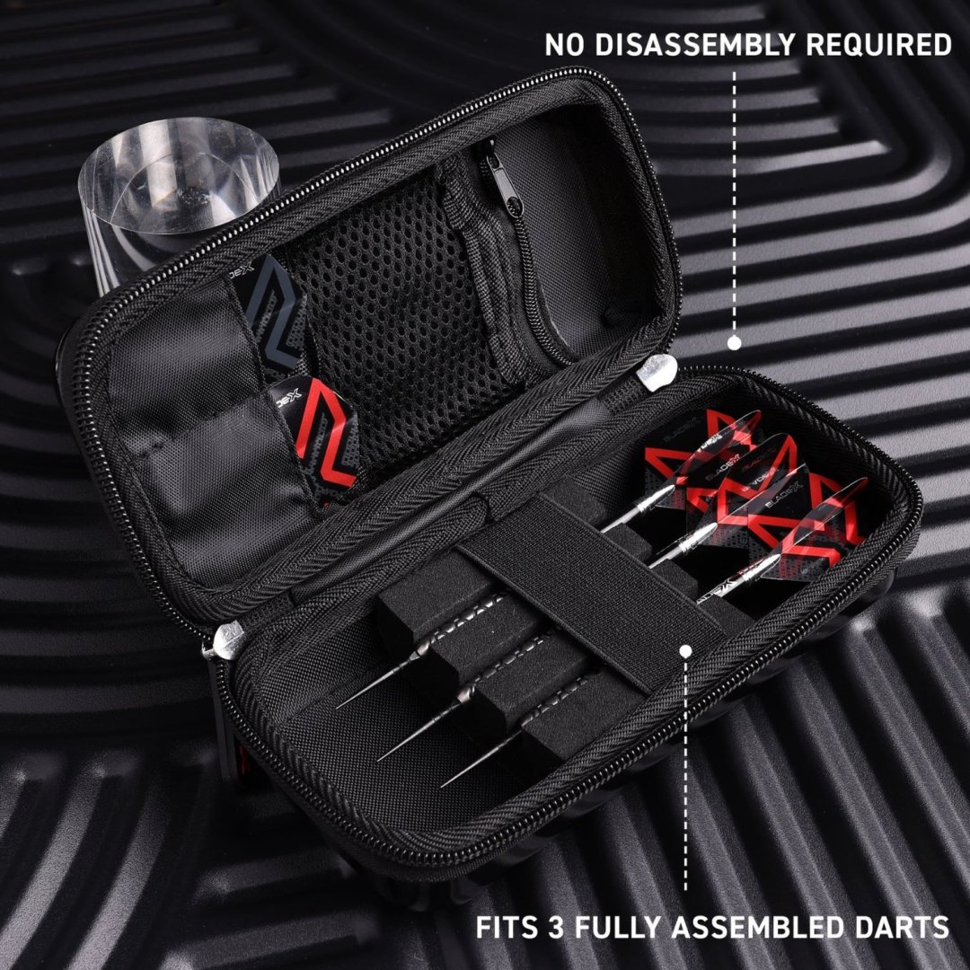 Nowoczesne etui na lotki Winmau Armor G1 to przestronne etui o doskonałej konstrukcji, które zapewnia ochronę jednego zestawu złożonych lotek bez konieczności wyjmowania eskadr. Etui ma wewnątrz kieszenie na akcesoria i jest wystarczająco mocne, aby nie ściskać eskadr w środku. Etui ma czarny kolor i jest ozdobione logo Blade X.