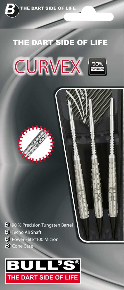 Rzutki Bull's Curvex z miękkiego wolframu są częścią linii eleganckich rzutek Bull's. Zostały wykonane w nowej technologii, która zapewnia graczowi doskonały, stabilny chwyt rzutki. Znajdziesz na nich wygrawerowane logo Bull's i napis Curvex. Lufy są uzupełnione uchwytami Tecno Alu i łatami Power Flite. Zapakowane w plastikową walizkę.